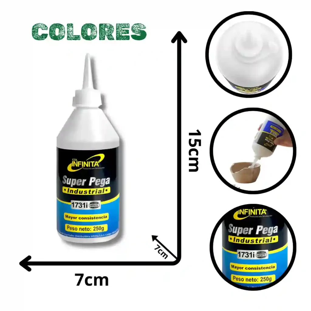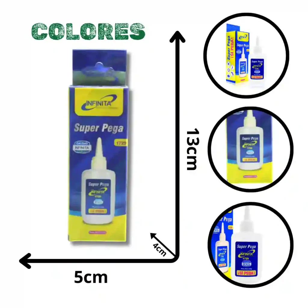 Adhesivo de alto rendimiento "Súper Pega - La Original" diseñado para reparaciones precisas y aplicaciones industriales o domésticas. Su fórmula está optimizada para ofrecer una unión fuerte en diversos materiales, garantizada por la calidad de la marca Infinita.