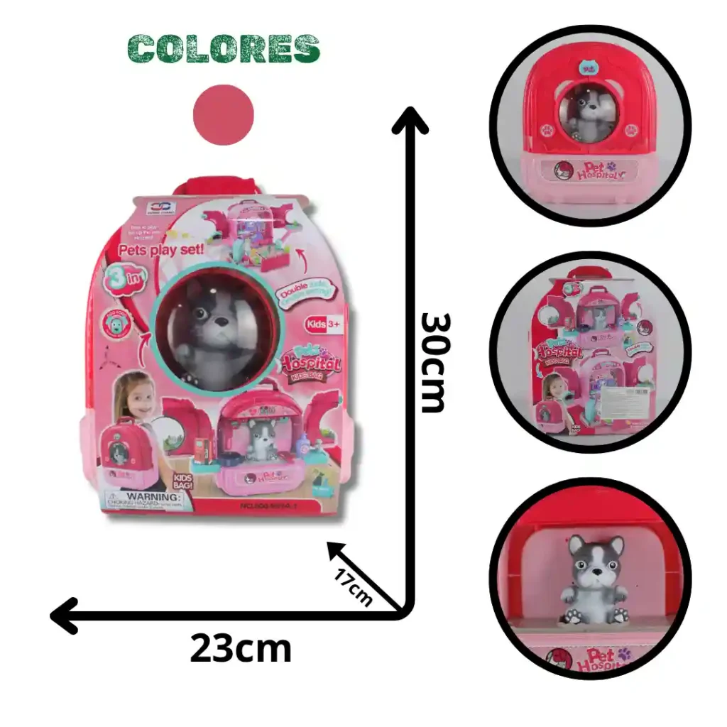 Este set de juego modular y portátil ofrece una experiencia completa de "Hospital Veterinario" en un formato de maleta 3 en 1. El diseño innovador permite que el niño lleve el juguete como mochila (Kids Bag), lo despliegue en un puesto de veterinario de doble cara (Double Side, Double Setting), y juegue con la figura de la mascota y los accesorios. Es un artículo de alta comercialización en el segmento de juguetes de rol.