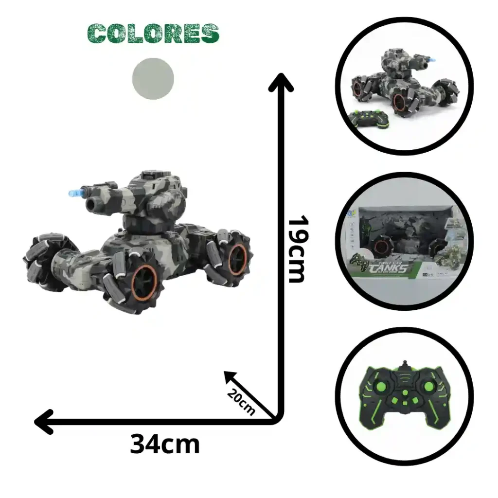 Este vehículo de control remoto combina la robustez de un tanque militar con la funcionalidad de un Stunt Car gracias a sus ruedas Mecanum o de rodillos, permitiendo movimientos laterales y giros de 360 grados. Además, integra la función de lanzamiento de proyectiles de agua (Water Bomb), ofreciendo una experiencia de juego altamente interactiva y atractiva para niños mayores de 6 años.
