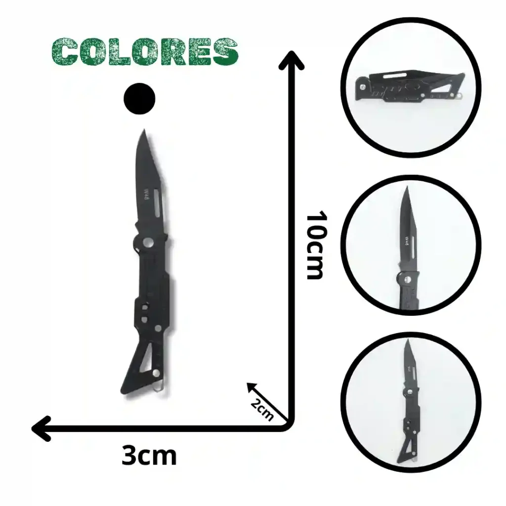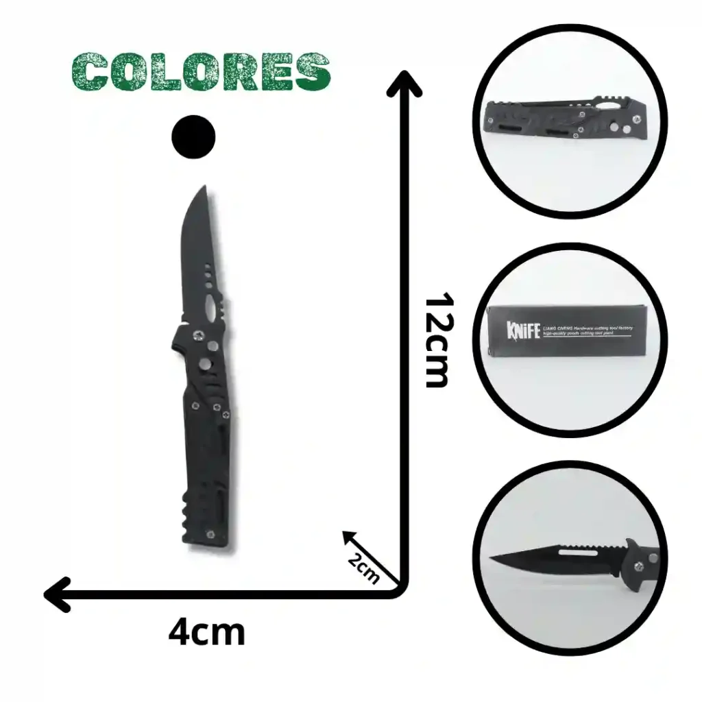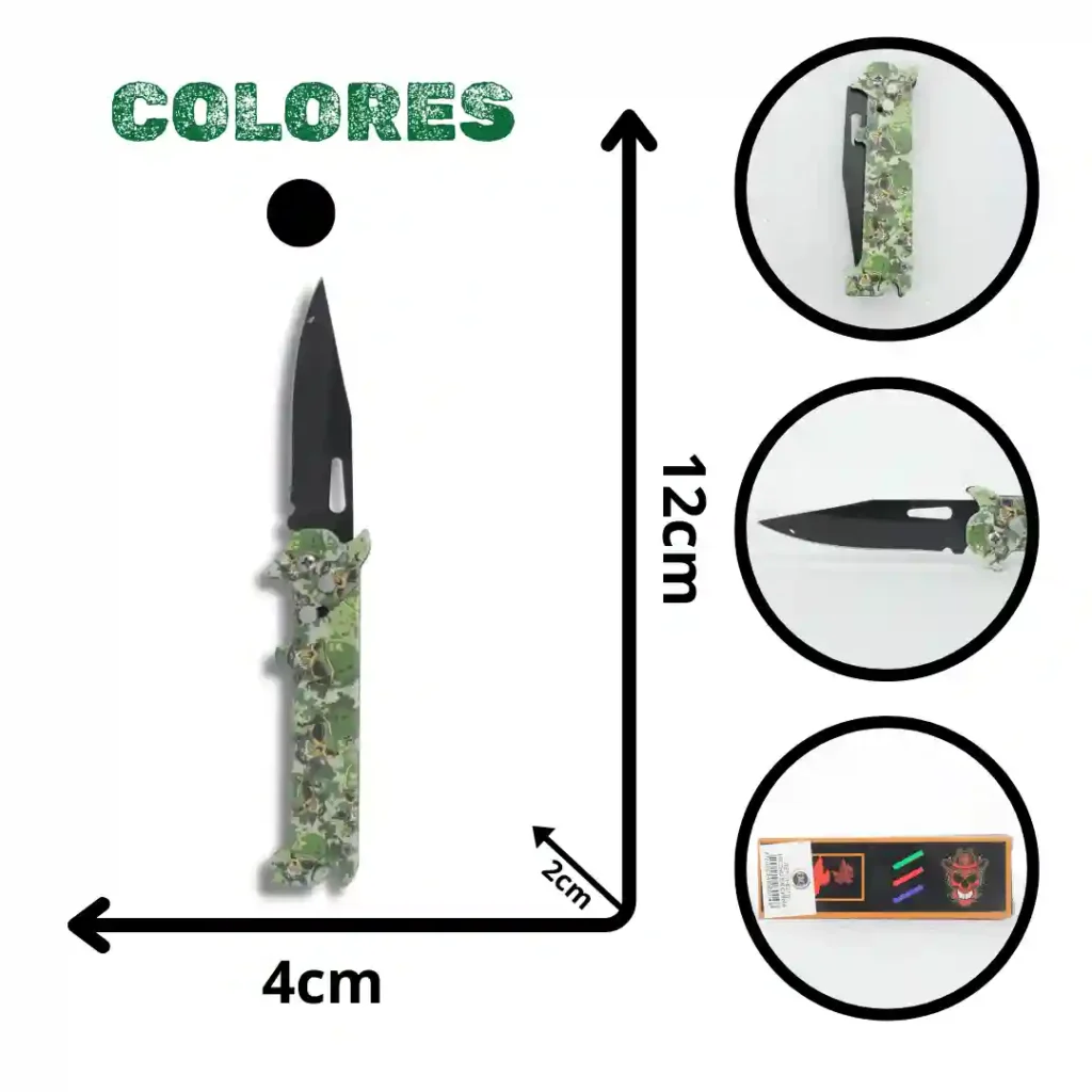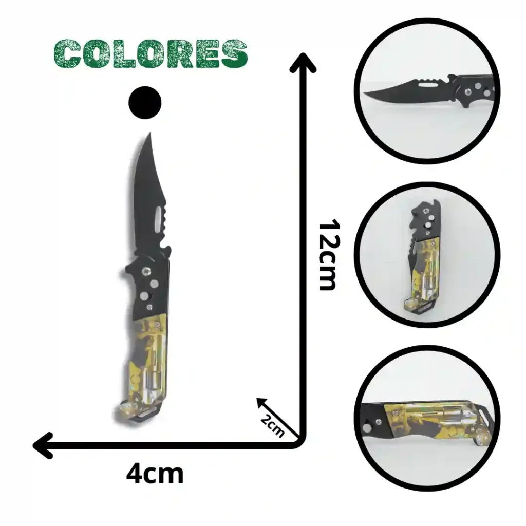 Navaja táctica de diseño ergonómico y compacto, ideal para actividades de supervivencia y uso diario. Cuenta con una estructura robusta que combina un mango texturizado para un agarre seguro y una hoja de acero resistente, presentada en un empaque temático que resalta su calidad profesional.