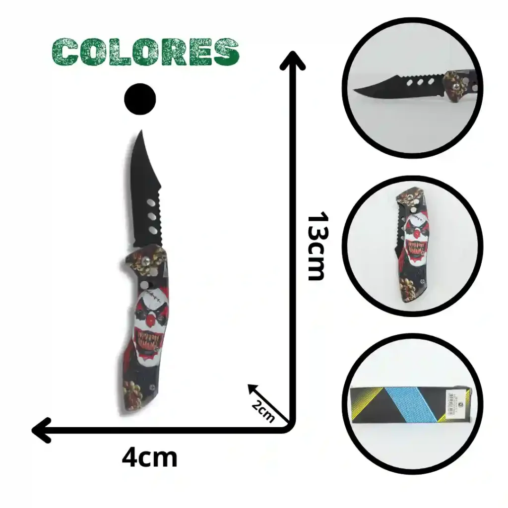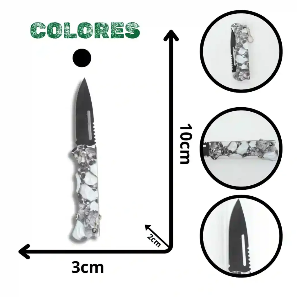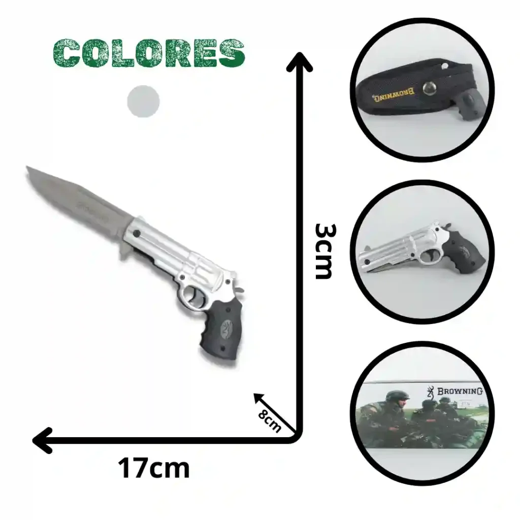 Herramienta de corte con diseño temático coleccionable en forma de pistola, que combina funcionalidad y estética. Cuenta con un mecanismo de apertura automática y está fabricada con materiales que garantizan durabilidad y un agarre ergonómico. El conjunto se presenta en un estuche rígido diseñado para la protección y el transporte seguro del artículo.