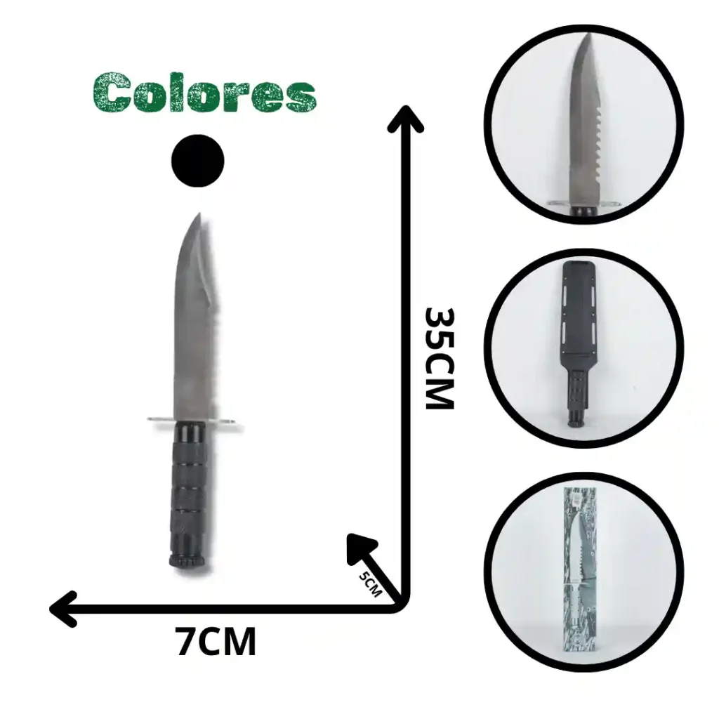 Material: Hoja de Acero Inoxidable de alta calidad; empuñadura con revestimiento en patrón de camuflaje militar (color verde).