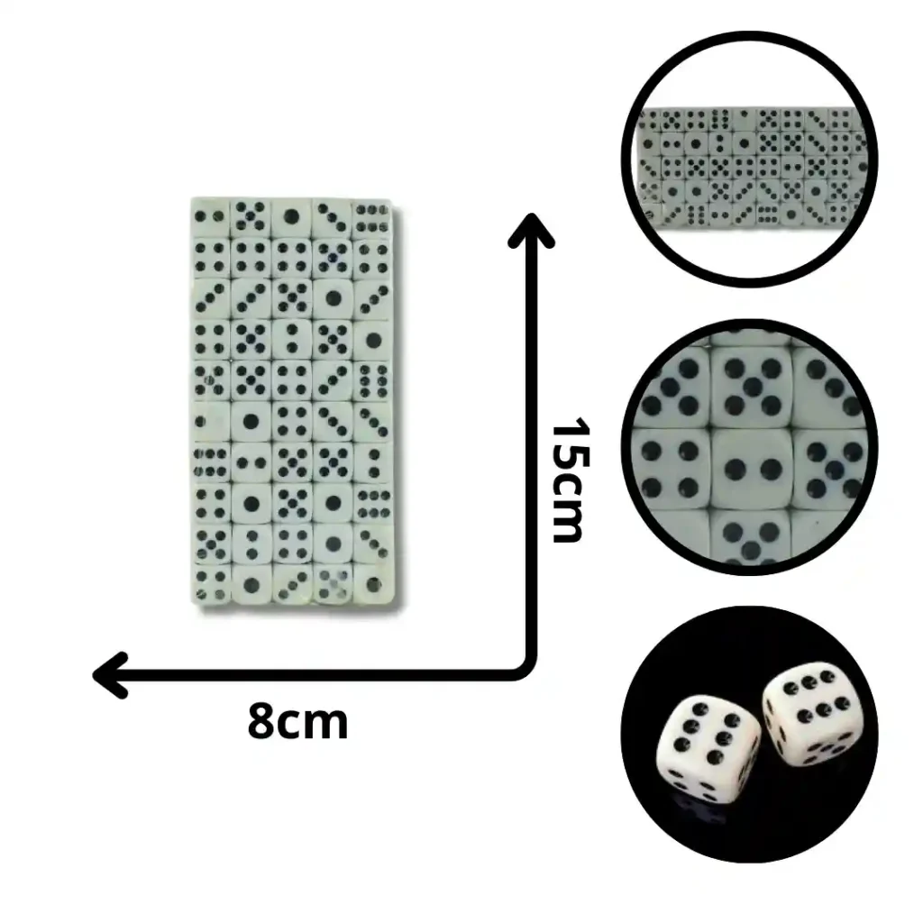 Este paquete de 100 dados blancos es un producto esencial para revendedores y distribuidores que buscan un artículo de alta demanda y bajo costo. Los dados están hechos de un plástico duradero y tienen puntos negros claramente marcados en cada una de sus caras. Son ideales para una variedad de juegos de mesa, actividades educativas, y como material para proyectos de manualidades o decoraciones.