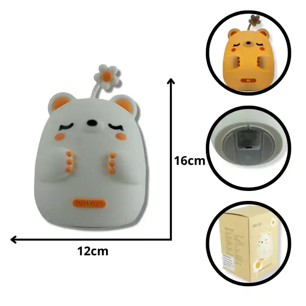 Te presento la lámpara y humidificador Oso con Flor modelo ZAY-L03, un detalle perfecto que combina dulzura y funcionalidad. Este pequeño osito de peluche sostiene una flor que se ilumina con una luz suave y cálida, creando un ambiente mágico y relajante en cualquier habitación.