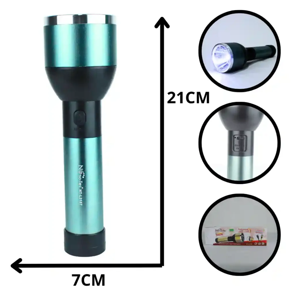 Te presento la linterna recargable Nano-Tec NT-L3197, una linterna que combina elegancia con funcionalidad. Su diseño es moderno y robusto, con un acabado en color verde azulado y detalles en negro que la hacen destacar. Con un tamaño de 21 cm de alto y 7 cm de ancho, es cómoda de sostener y fácil de guardar.