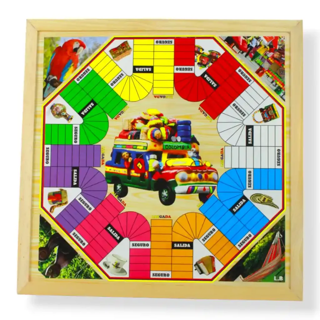 Te ofrece la combinación perfecta de dos clásicos juegos de mesa en un solo producto, ideal para horas de entretenimiento en casa. Por un lado, encontrarás un tablero de Parqués bellamente ilustrado con motivos que rinden homenaje a la cultura colombiana, con sus casillas de "Salida" y "Seguro" claramente diferenciadas para una experiencia de juego fluida.