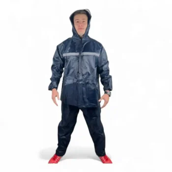 Impermeable tipo conjunto de dos piezas que incluye chaqueta y pantalón, diseñado para una protección completa contra la lluvia. Este producto destaca por su alta visibilidad y materiales resistentes, ideal para motociclistas y trabajadores a la intemperie.