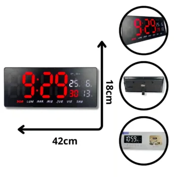 Reloj digital de pared con un amplio display LED, diseñado para proporcionar información clara y completa en un solo vistazo. Es una pieza moderna y funcional, ideal para una variedad de entornos, desde hogares hasta espacios comerciales.