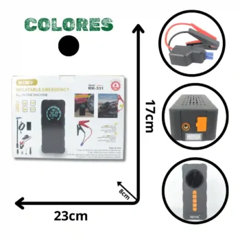 Máquina de emergencia todo en uno de diseño minimalista, diseñada para ofrecer soluciones integrales de energía y asistencia vehicular en un solo dispositivo portátil. Este equipo multifuncional actúa como arrancador de batería para vehículos, bomba de inflado para neumáticos, banco de energía para dispositivos electrónicos y sistema de iluminación de emergencia.