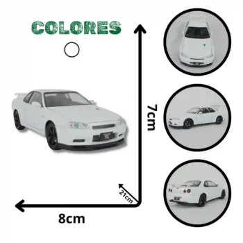 Acabado exterior: Pintura automotriz en color blanco sólido con detalles de logotipos y emblemas GT-R y Skyline aplicados con precisión.