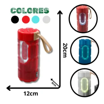 Dimensiones Aproximadas: Diseño compacto y cilíndrico, pensado para la portabilidad. El parlante incluye una correa de transporte para mayor comodidad.