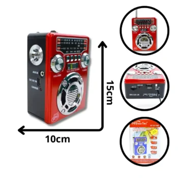 Radio de 8 bandas FM/AM/SW1-6. Reproductor USB y tarjeta TF. Altavoz portátil de gran potencia. Batería de litio recargable de alta calidad. Linterna LED integrada en el lateral. Antena telescópica de alta sensibilidad. Control de sintonización manual y control de volumen lateral. Entrada para cable de carga USB. Selector de funciones MP3, FM, AM y SW.
