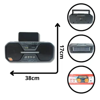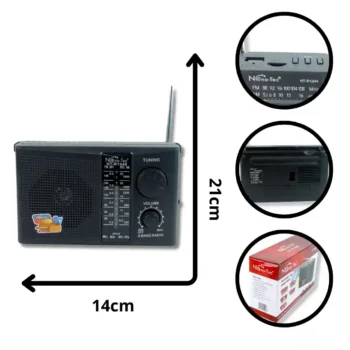 Es súper práctico, perfecto para llevar a cualquier lado. Mide 21 cm de alto, 14 cm de ancho y 12 cm de largo, así que cabe perfecto en tu mochila. No te dejes engañar por su tamaño, ¡suena increíblemente potente! Además de sintonizar tus emisoras favoritas de FM, AM y SW, también puedes reproducir tu música desde una memoria USB o tarjeta TF.