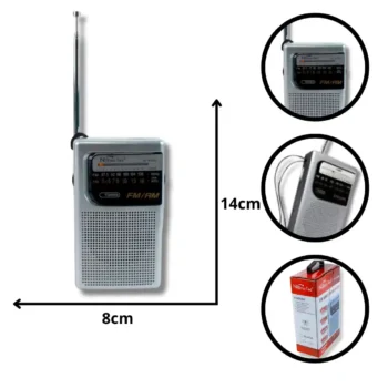 Este radio es perfecto para los que están siempre en movimiento. Es súper compacto, con un diseño que cabe en la palma de tu mano, así que lo puedes llevar en tu bolsillo, en tu mochila o en tu cartera. Pero no te dejes engañar por su tamaño, ¡es un monstruo de la funcionalidad! Sintoniza tus emisoras favoritas de AM, FM y SW1-9, así que siempre tendrás algo que escuchar.
