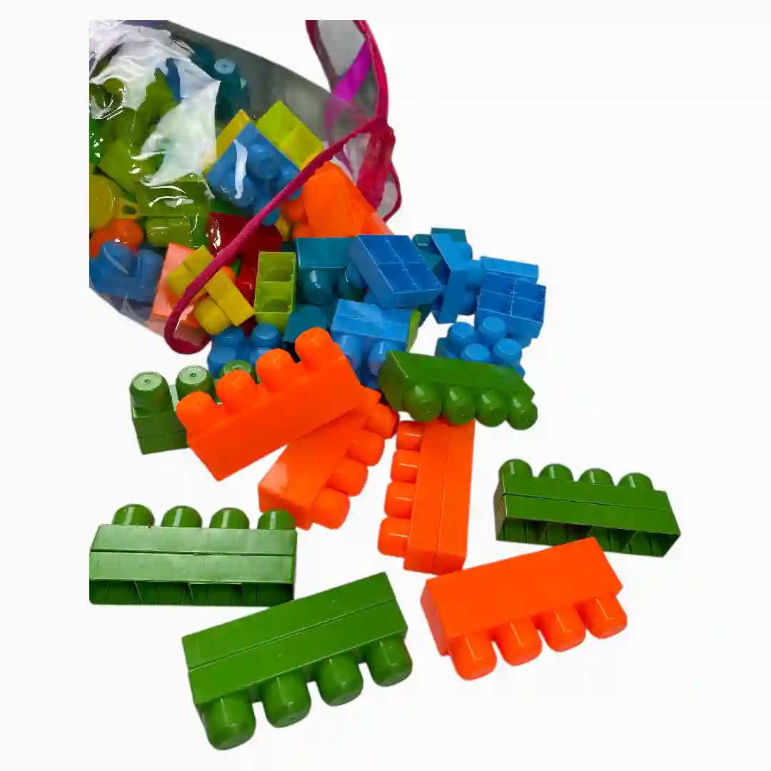 Referencia: Mega Bloques Titán. Modelo: Bloques de construcción de gran formato. Presentación: Bolsa plástica transparente con asa superior y cremallera rosa. Cantidad total de elementos: 150 piezas. Variaciones de piezas incluidas: Bloques rectangulares largos de 8 puntos (4×2). Bloques rectangulares medianos de 4 puntos (2×2). Bloques cuadrados de 2 puntos (1×2). Bloques con terminación redondeada. Piezas con bases para figuras o accesorios.