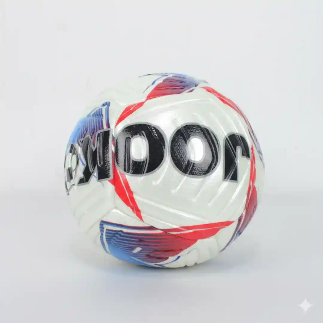 Balón de fútbol cosido a máquina, de tamaño reglamentario #5 y peso estándar de 420 gramos (aproximado). Este modelo presenta un diseño llamativo en colores blanco, rojo y azul, lo que lo hace muy atractivo para el cliente juvenil y para uso recreativo. Es un producto de consumo masivo con un excelente balance entre visibilidad, funcionalidad y precio de adquisición.