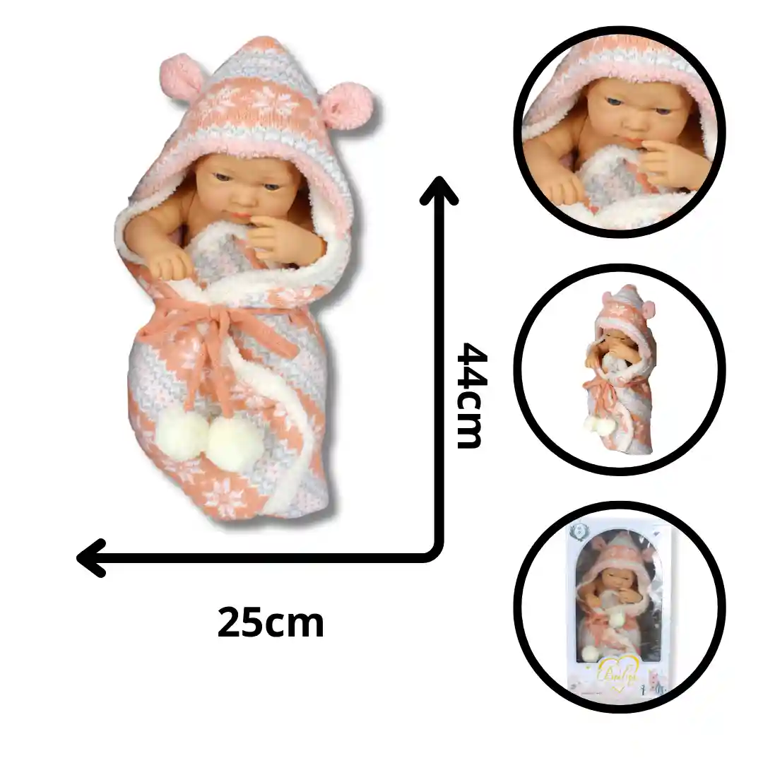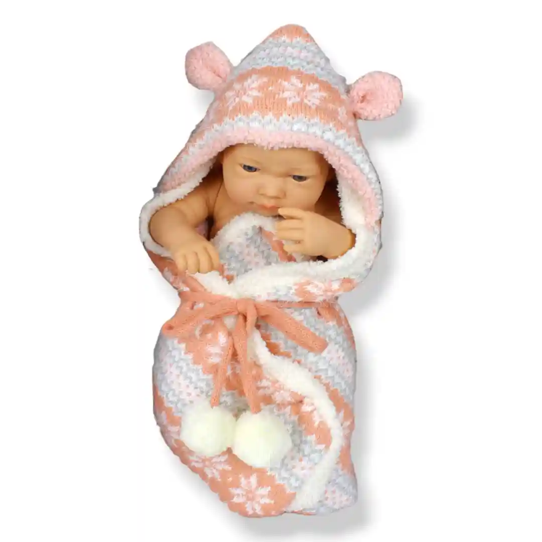 Contenido del Paquete: 1 muñeco bebé, 1 cobija tejida con capucha.