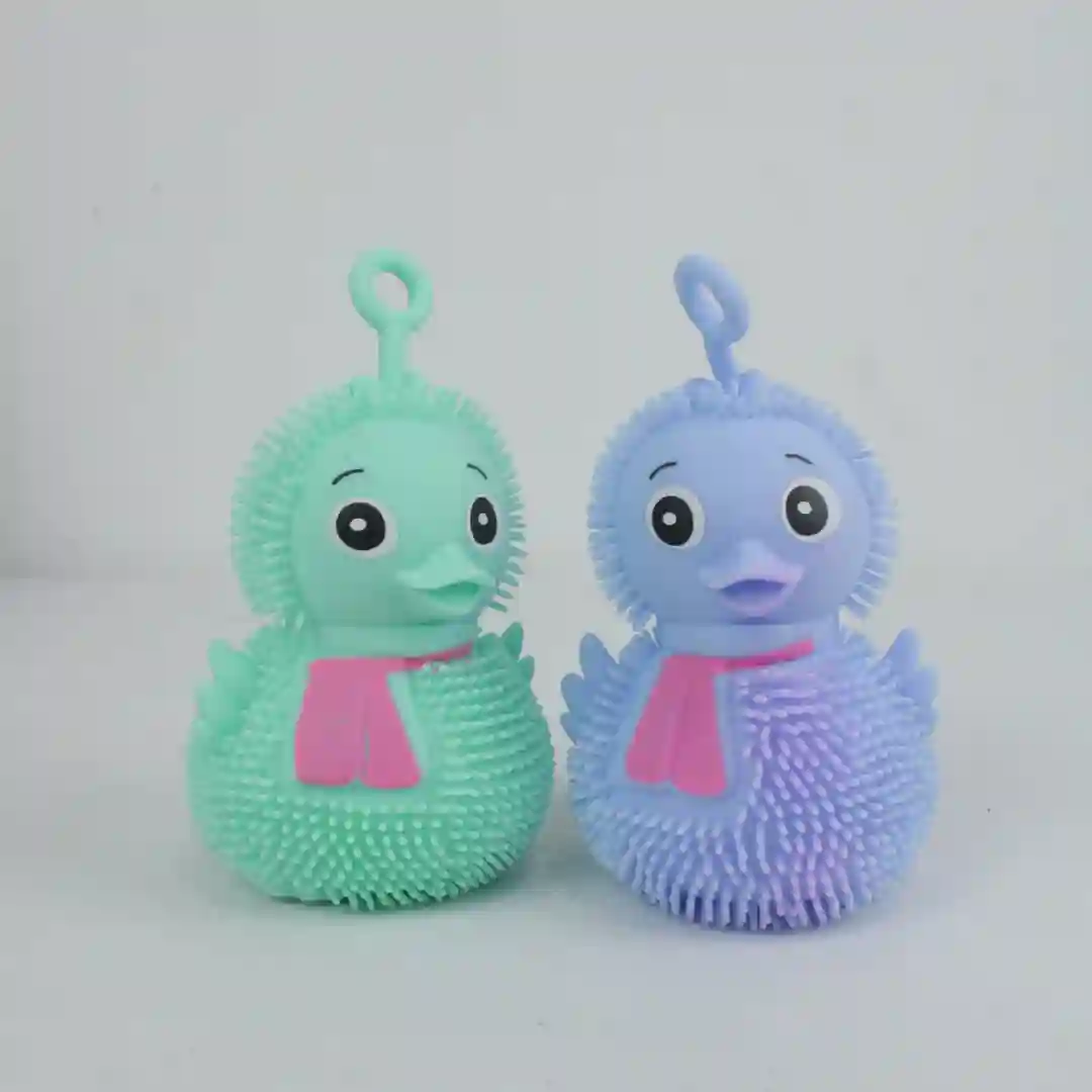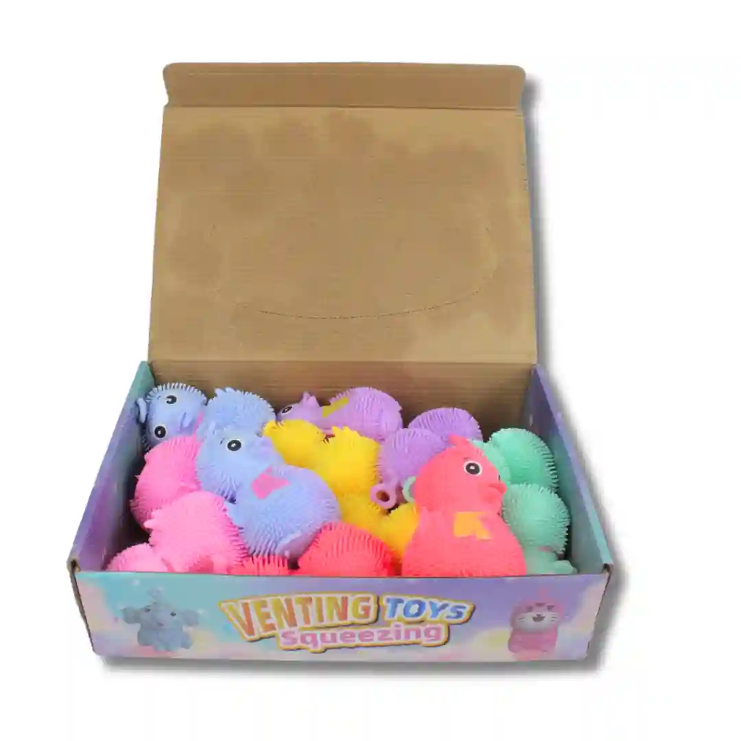 Juguetes de ventilación para apretar con un diseño amigable de pato y diversos animales. Estos artículos sensoriales presentan una textura de púas suaves y elásticas, ideales para la estimulación táctil y el alivio del estrés. Cada unidad cuenta con un anillo de sujeción en la parte superior y detalles coloridos como bufandas integradas en el diseño.