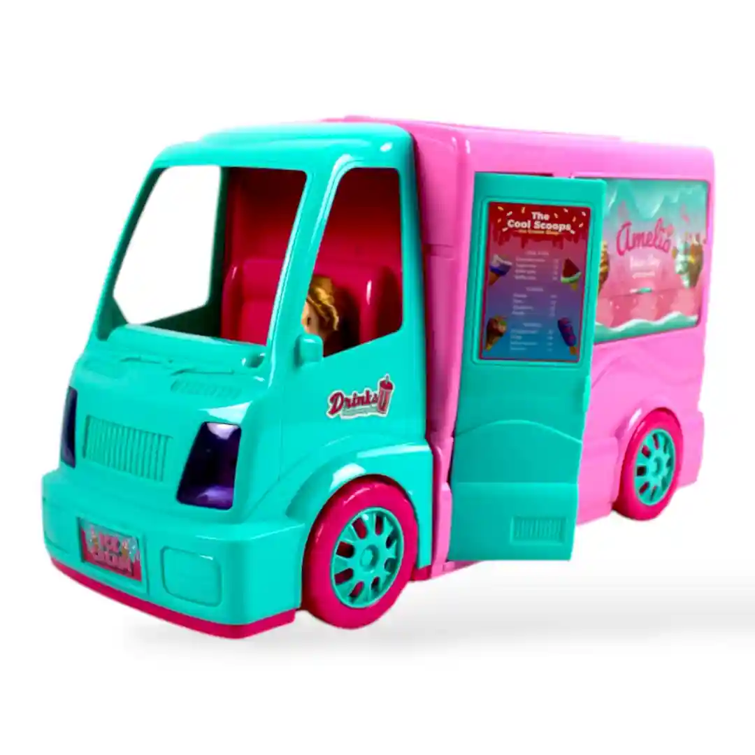 Un Diseño que Deleita la Vista y Abre un Mundo de Juego: Este llamativo autobús heladero combina colores alegres de turquesa y rosa vibrante, destacando con detalles como ruedas en color magenta y gráficos divertidos que anuncian «Drinks» y «Ice Cream». Pero la verdadera magia comienza cuando el camión se abre, revelando un interior completamente equipado que simula una verdadera tienda de postres y helados.