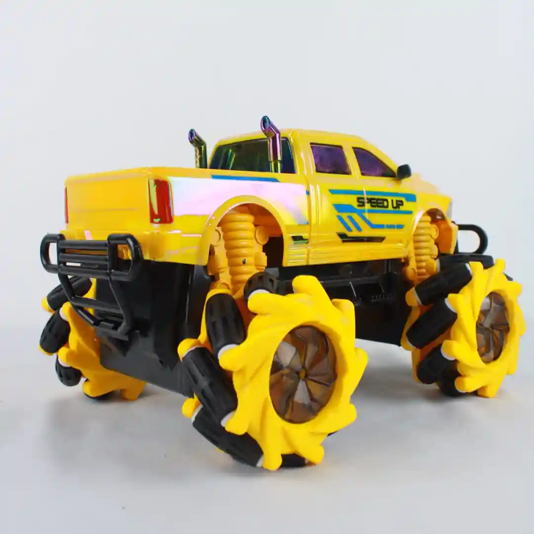 Este es un vehículo de juguete todoterreno diseñado para la acción, con un diseño de gran tamaño y un estilo agresivo que lo hace destacar. Su construcción robusta y su sistema de movimiento por fricción lo convierten en un juguete de alta durabilidad, sin necesidad de baterías. El diseño presenta una camioneta 4×4 con una combinación de colores vibrantes y pegatinas de estilo «off-road», que le confieren un atractivo visual fuerte para el público infantil.