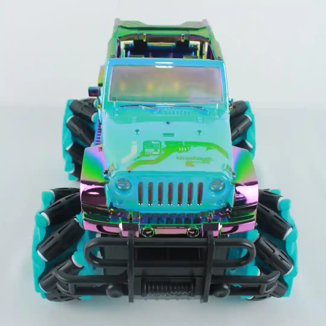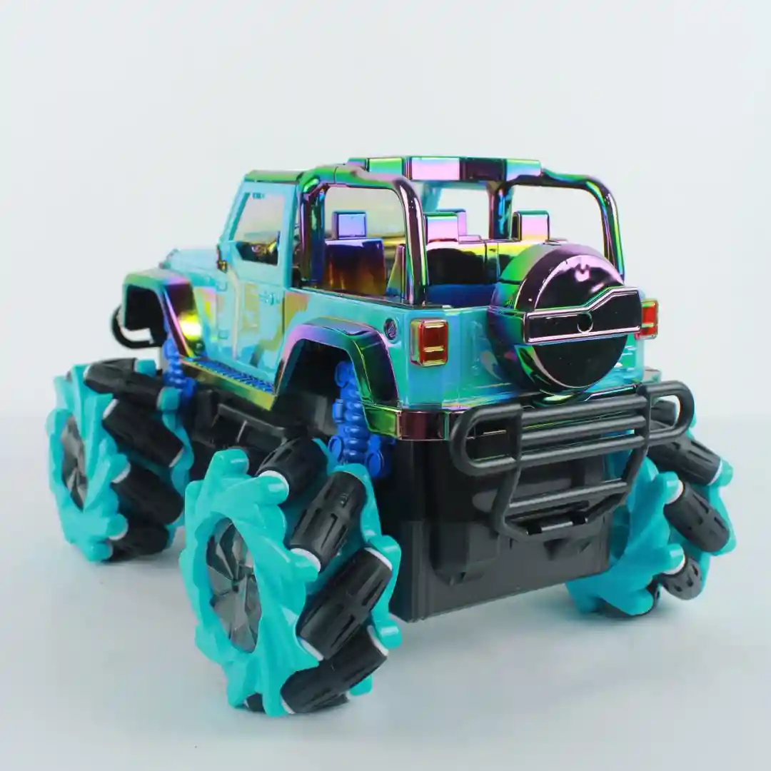 Este es un vehículo de juguete todoterreno diseñado para la acción, con un diseño de gran tamaño y un estilo agresivo que lo hace destacar. Su construcción robusta y su sistema de movimiento por fricción lo convierten en un juguete de alta durabilidad, sin necesidad de baterías. El diseño presenta una camioneta tipo Jeep en un llamativo color azul con pegatinas de estilo «X-Monster», que le confieren un atractivo visual fuerte para el público infantil y juvenil.