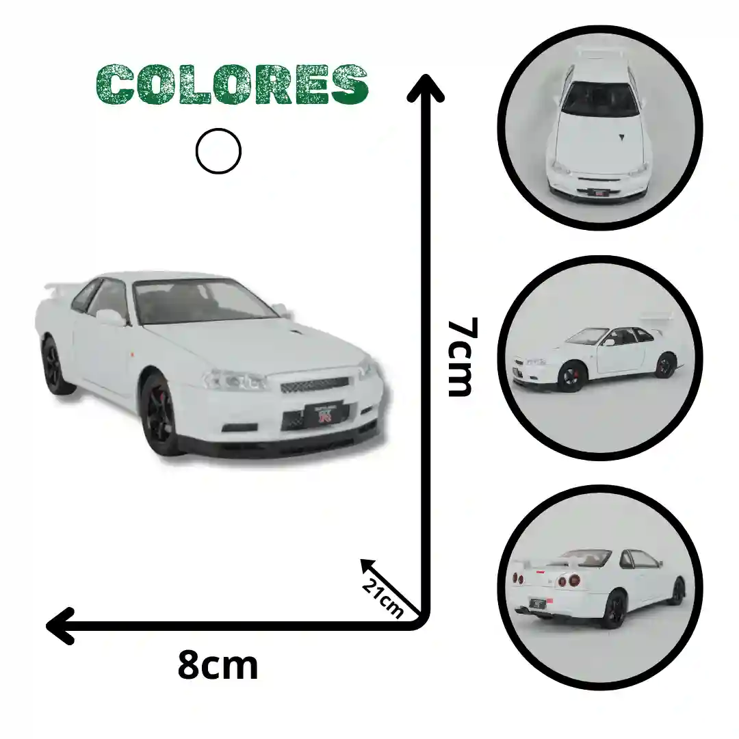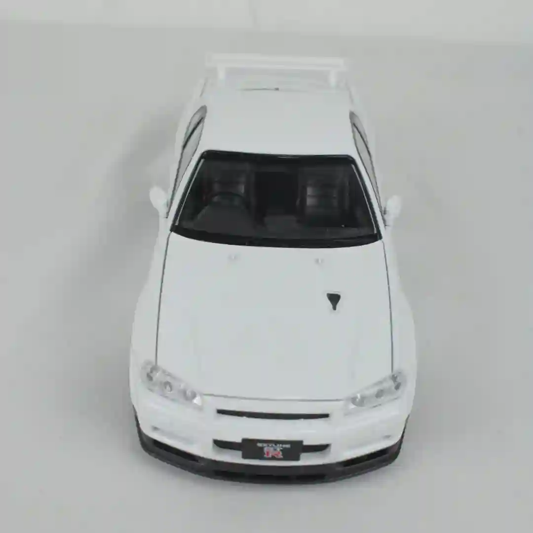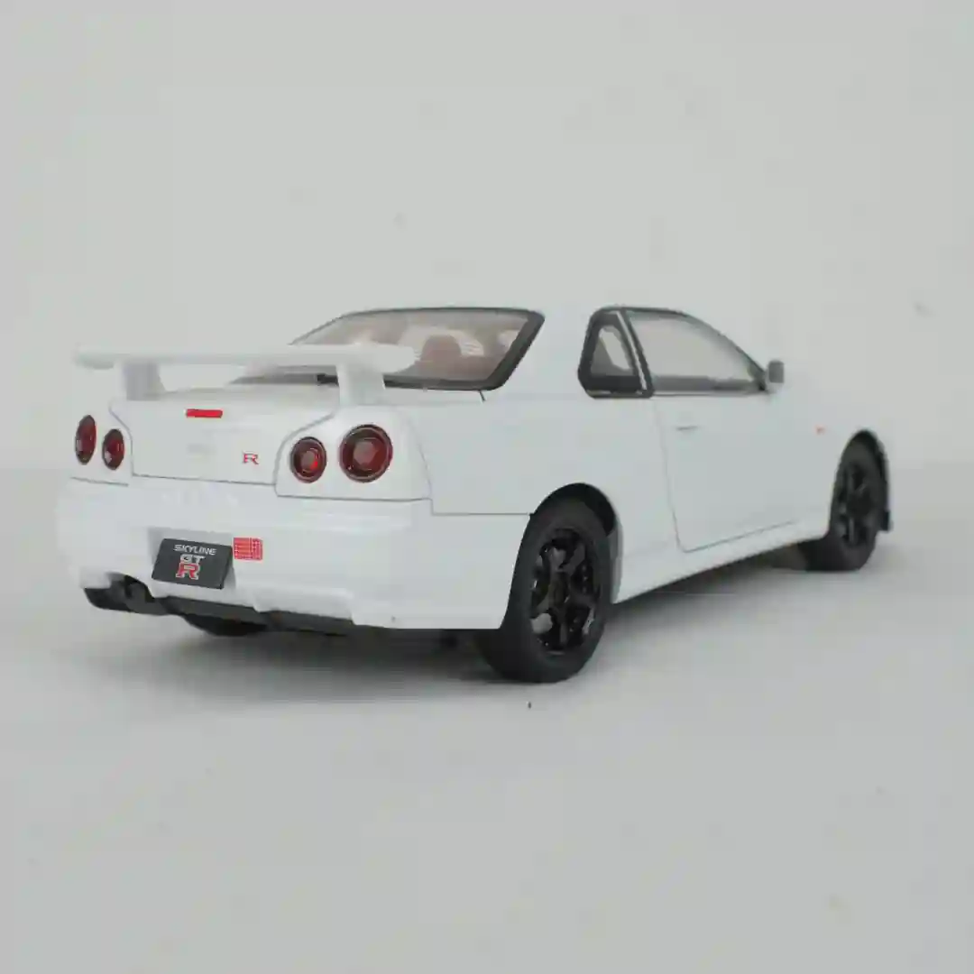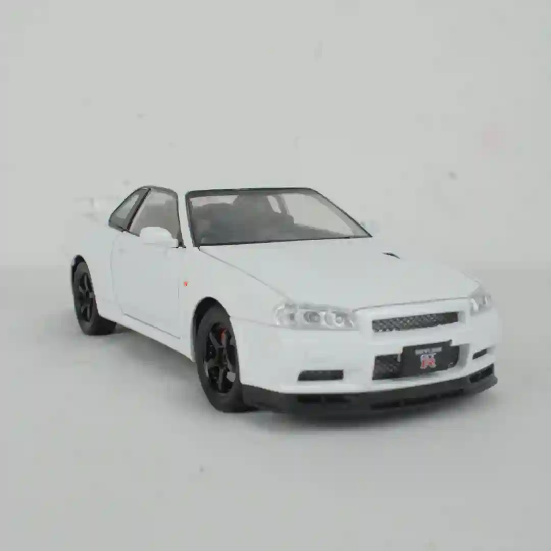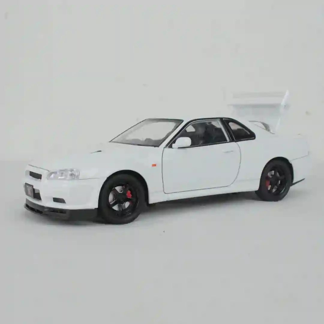 Vehículo a escala de alta fidelidad que replica el icónico diseño del Nissan Skyline GT-R (R34). Este modelo está fabricado con una combinación de materiales resistentes y acabados detallados, posicionándose como un artículo de alta demanda tanto para el mercado de juguetes de gama media-alta como para coleccionistas entusiastas del automovilismo deportivo japonés (JDM).