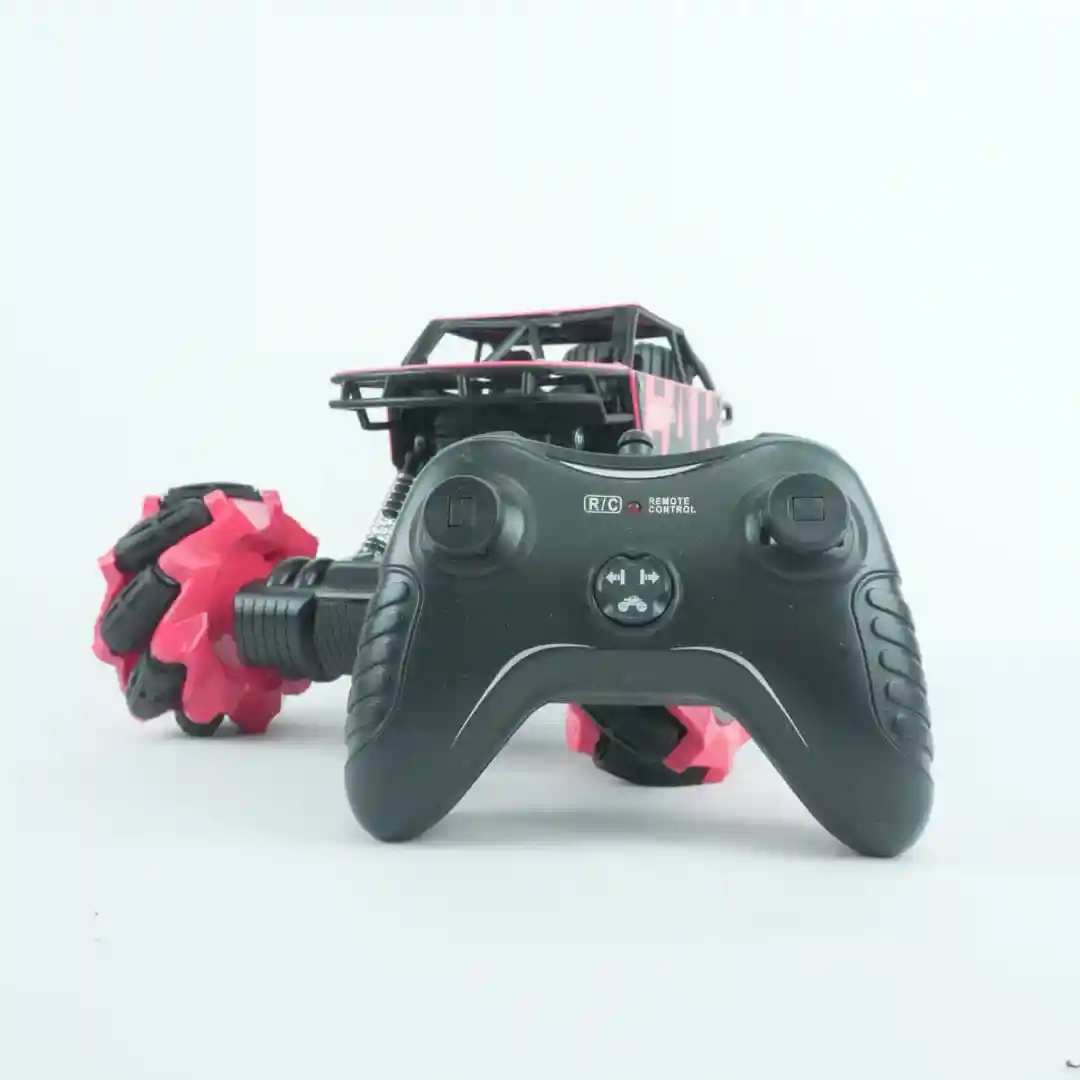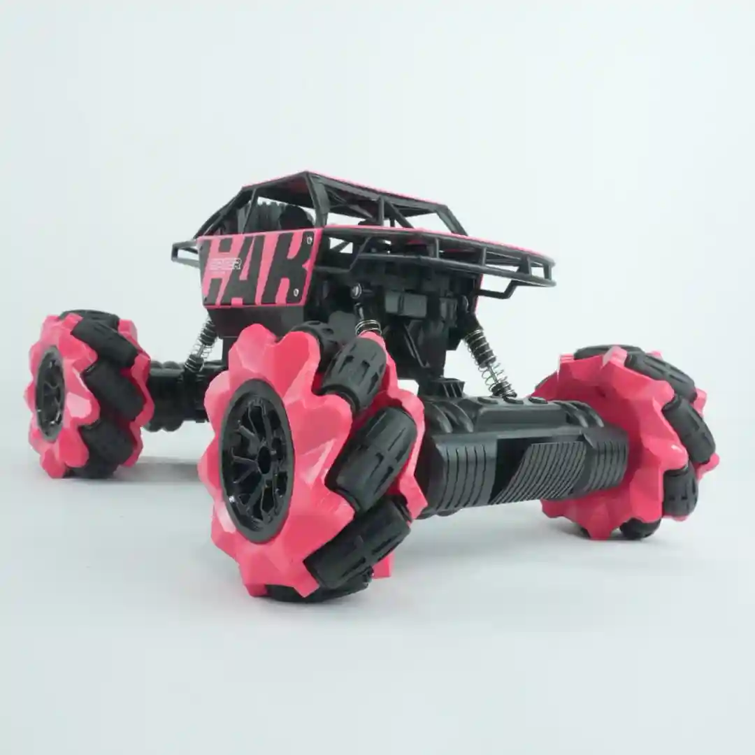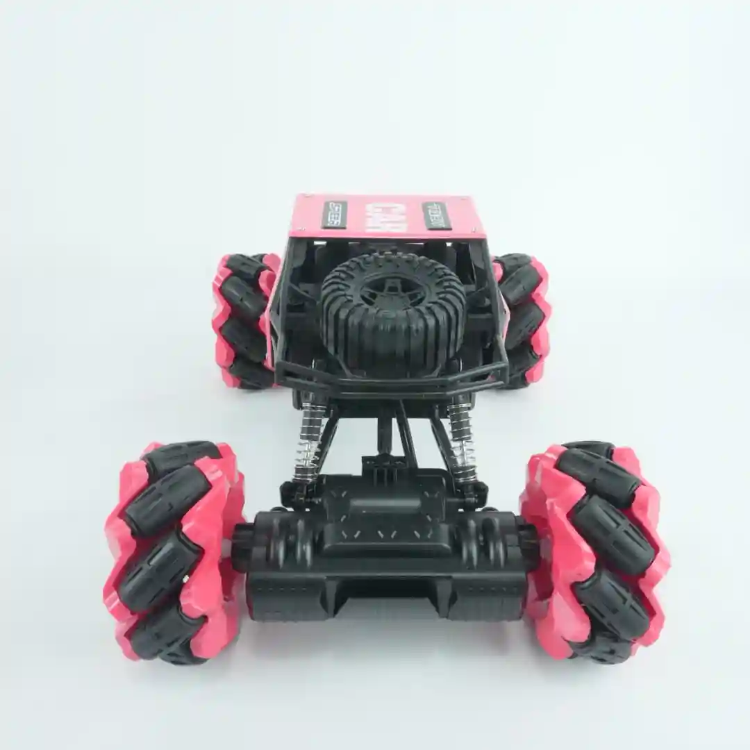 Lo primero que salta a la vista son sus imponentes ruedas especiales de color rosado y negro. Estas no son ruedas comunes; son ruedas con múltiples rodillos pequeños incrustados, una característica que indica que este es un carro de control remoto con capacidad de movimiento lateral (o de derrape). Esto significa que puede realizar maniobras que un coche RC tradicional no podría, añadiendo una capa increíble de destreza a la experiencia de manejo.