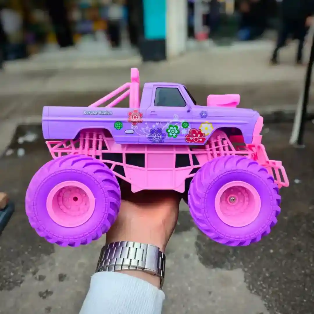 Vehículo todoterreno a escala con función de control remoto completo, diseñado con estética vibrante y llamativa, ideal para el público infantil y juvenil femenino. Ofrece una experiencia de juego dinámica y promueve la coordinación mano-ojo.