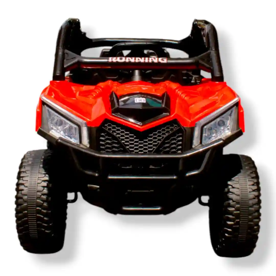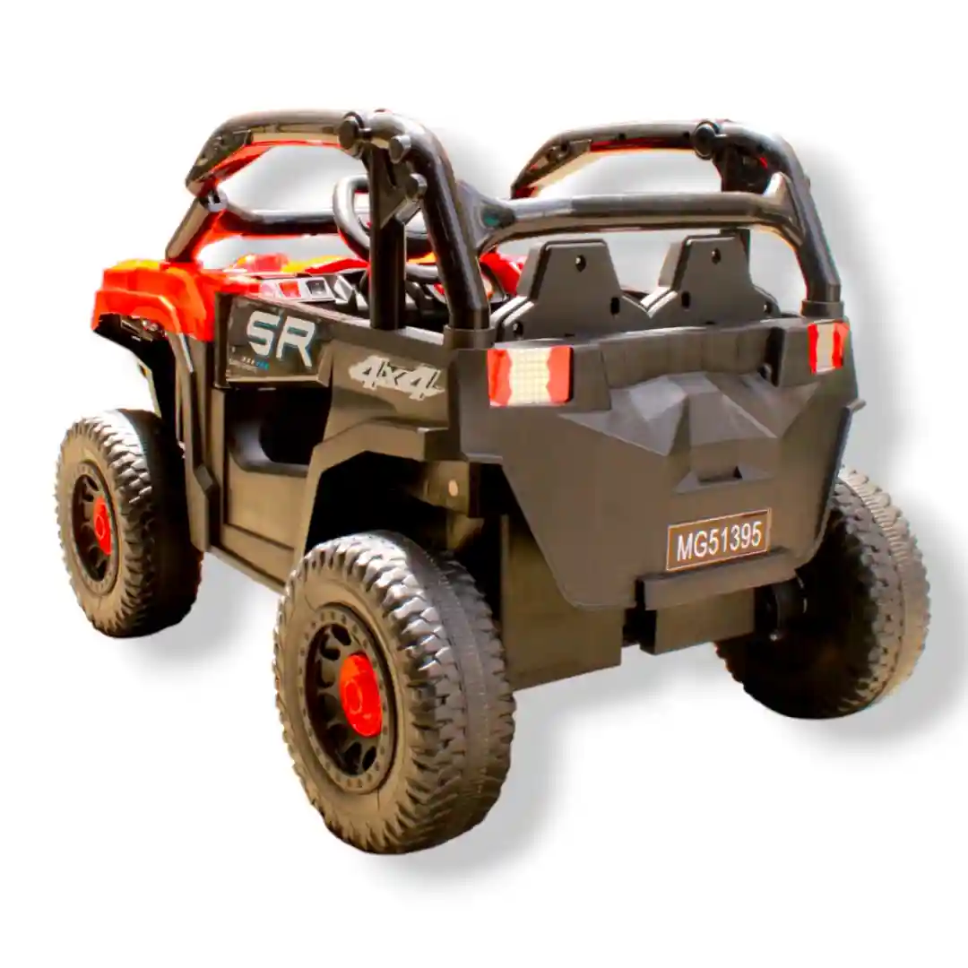 Diseño Robusto y Deportivo en Rojo Vibrante: El Carro Descapotado MG51395 destaca por su vibrante color rojo, que le otorga una presencia llamativa y deportiva. Las imágenes muestran un diseño tipo buggy o todoterreno, con una robusta jaula antivuelco en color negro que no solo añade realismo, sino que también ofrece un elemento de seguridad visual. Los grandes faros delanteros con aspecto de LED y las luces traseras rojas le dan un toque auténtico y moderno. Los detalles en negro en la parrilla frontal, los guardabarros y el chasis complementan perfectamente el rojo intenso, creando un contraste dinámico. Las calcomanías laterales con «SR» y «4×4» refuerzan su espíritu aventurero.
