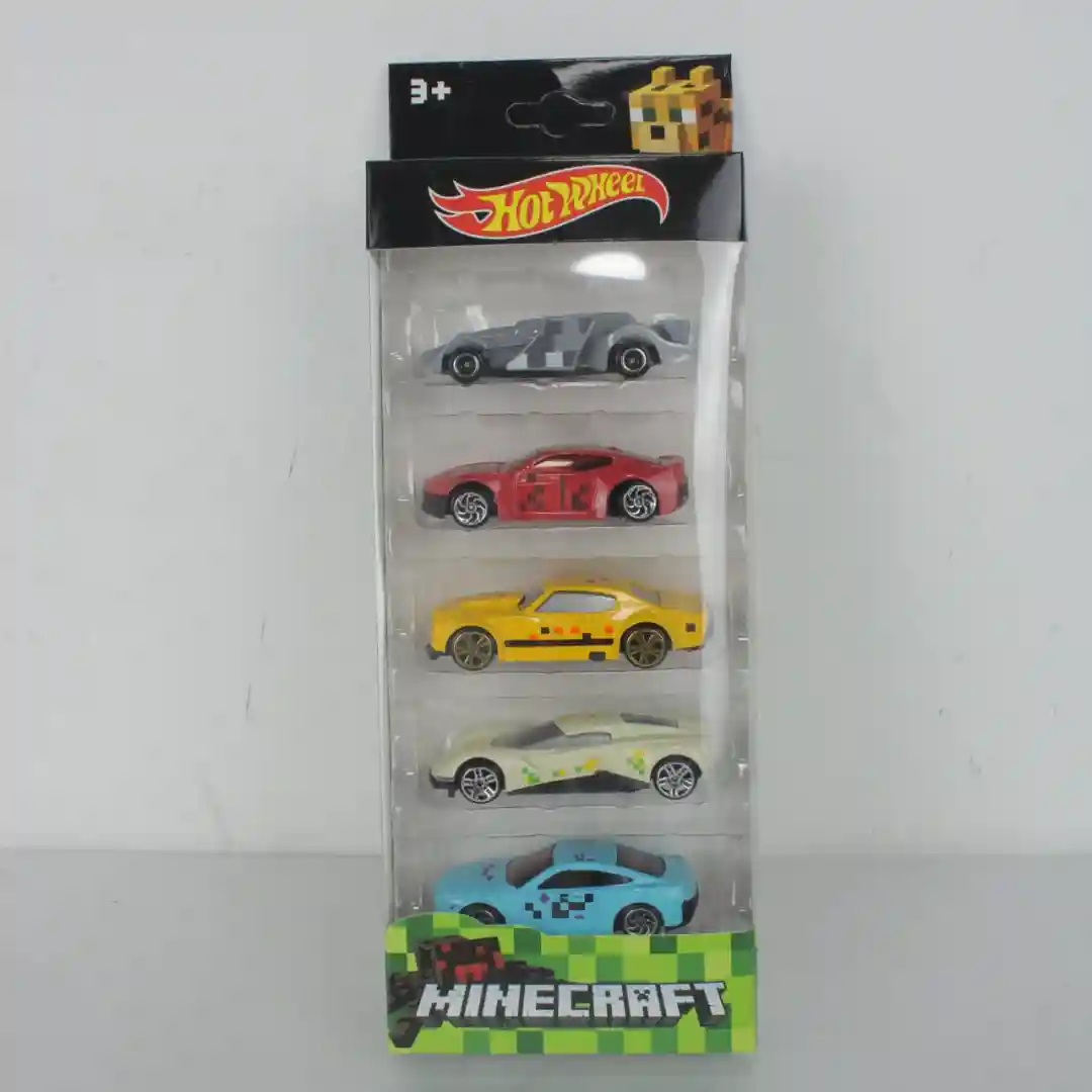 Presentación: Empaque individual en blíster transparente vertical, que exhibe los cinco (5) vehículos. La parte inferior de la caja presenta gráficos con bloques de Minecraft y personajes del juego.