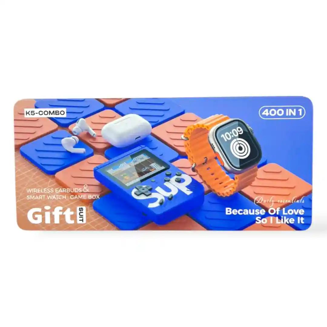 Sumérgete en la experiencia tecnológica definitiva con el exclusivo K5-COMBO, un paquete 3 en 1 diseñado para el entusiasta moderno. Este combo cuidadosamente seleccionado incluye un Reloj Inteligente Ultra, unos Audífonos Inalámbricos tipo AirPods y una Consola de Juegos Retro SUP con 400 juegos clásicos, todo pensado para acompañarte en tu día a día con estilo, funcionalidad y entretenimiento ilimitado.