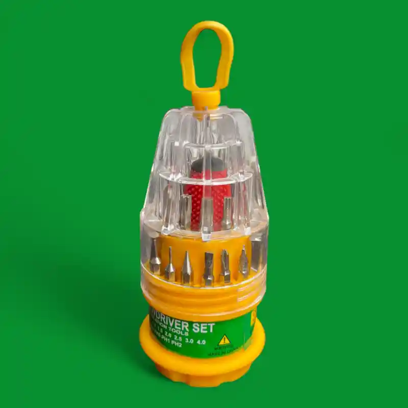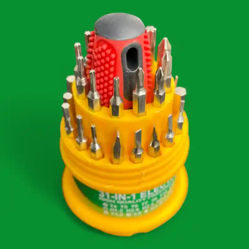 El Destornillador Piña 31 en 1 SIC-4 es un kit de herramientas compacto y versátil, ideal para trabajos de precisión en electrónica, celulares, computadoras, electrodomésticos, relojería y mucho más. Su diseño tipo «piña» facilita el almacenamiento y la organización de las puntas, permitiendo un acceso rápido y sencillo a la herramienta que necesitas.