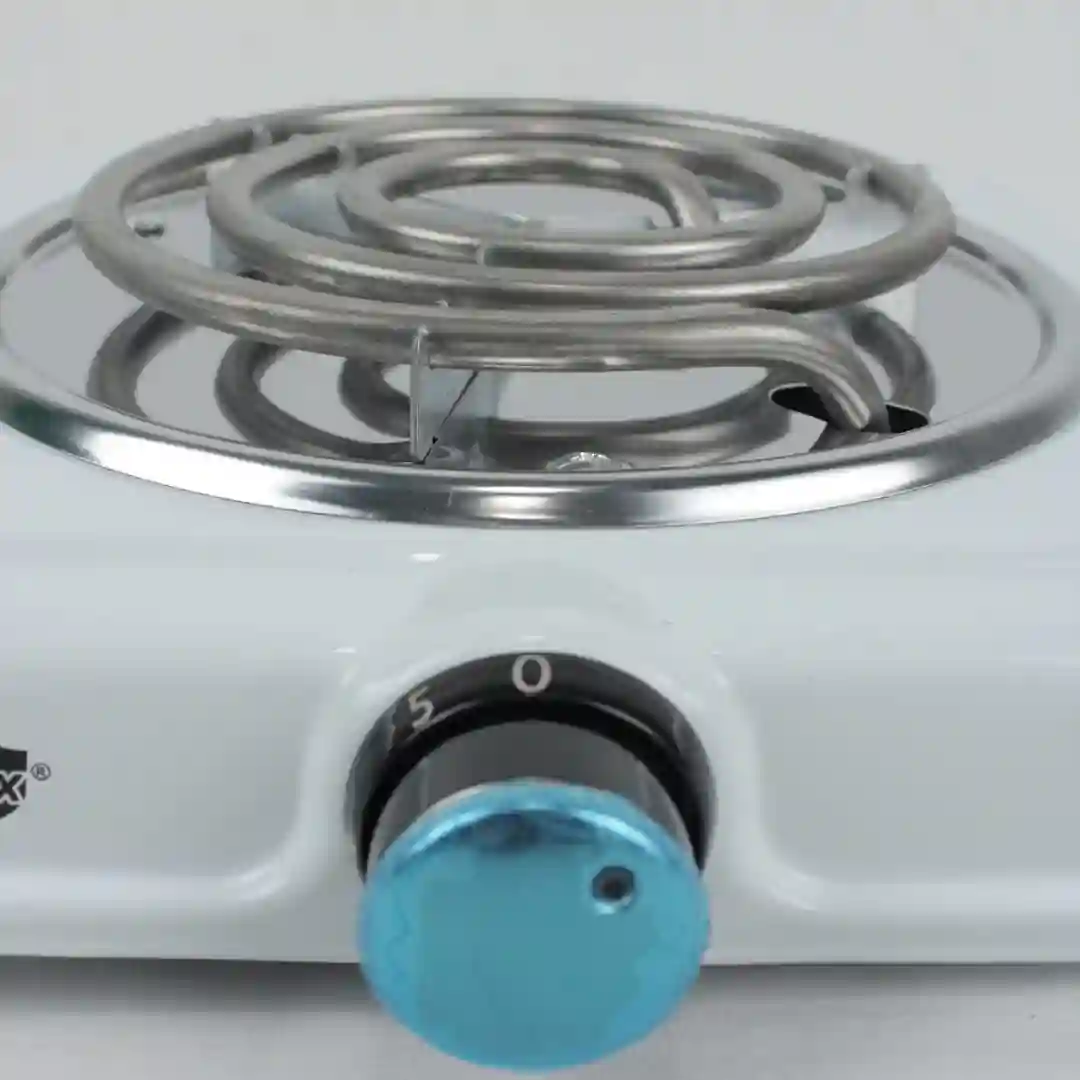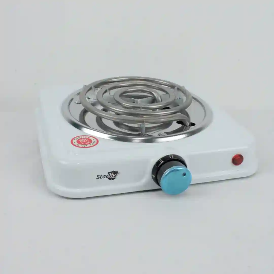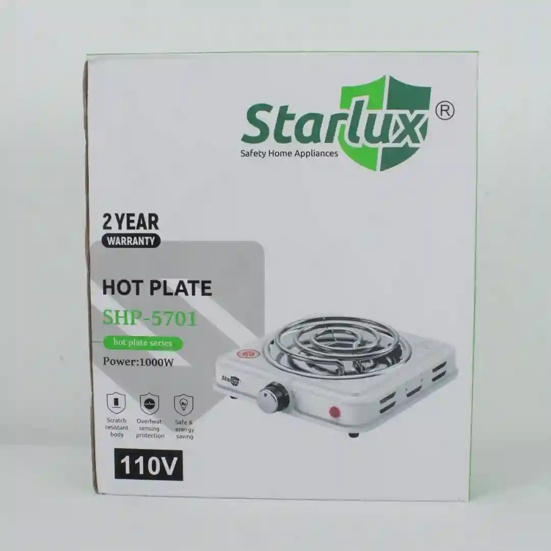 Plancha de calentamiento eléctrica de un solo puesto, perteneciente a la serie de electrodomésticos seguros para el hogar de la marca Starlux. Este modelo SHP-5701 está diseñado con una resistencia en espiral de alto rendimiento, ideal para espacios reducidos o como unidad auxiliar de cocina, garantizando una distribución eficiente del calor y un manejo sencillo mediante su control analógico frontal.