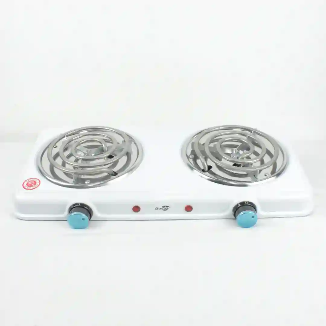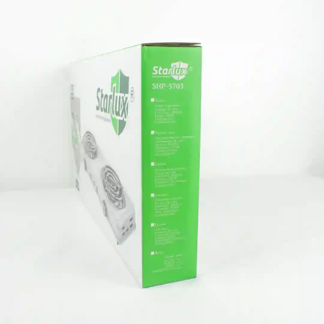Plancha de calentamiento eléctrica de doble puesto diseñada para ofrecer eficiencia y seguridad en la cocina. Este modelo de la serie de electrodomésticos seguros para el hogar de Starlux cuenta con dos quemadores de resistencia en espiral independientes, ideales para preparar múltiples alimentos simultáneamente. Su diseño compacto y funcional incluye controles de temperatura individuales y una estructura resistente de fácil limpieza.