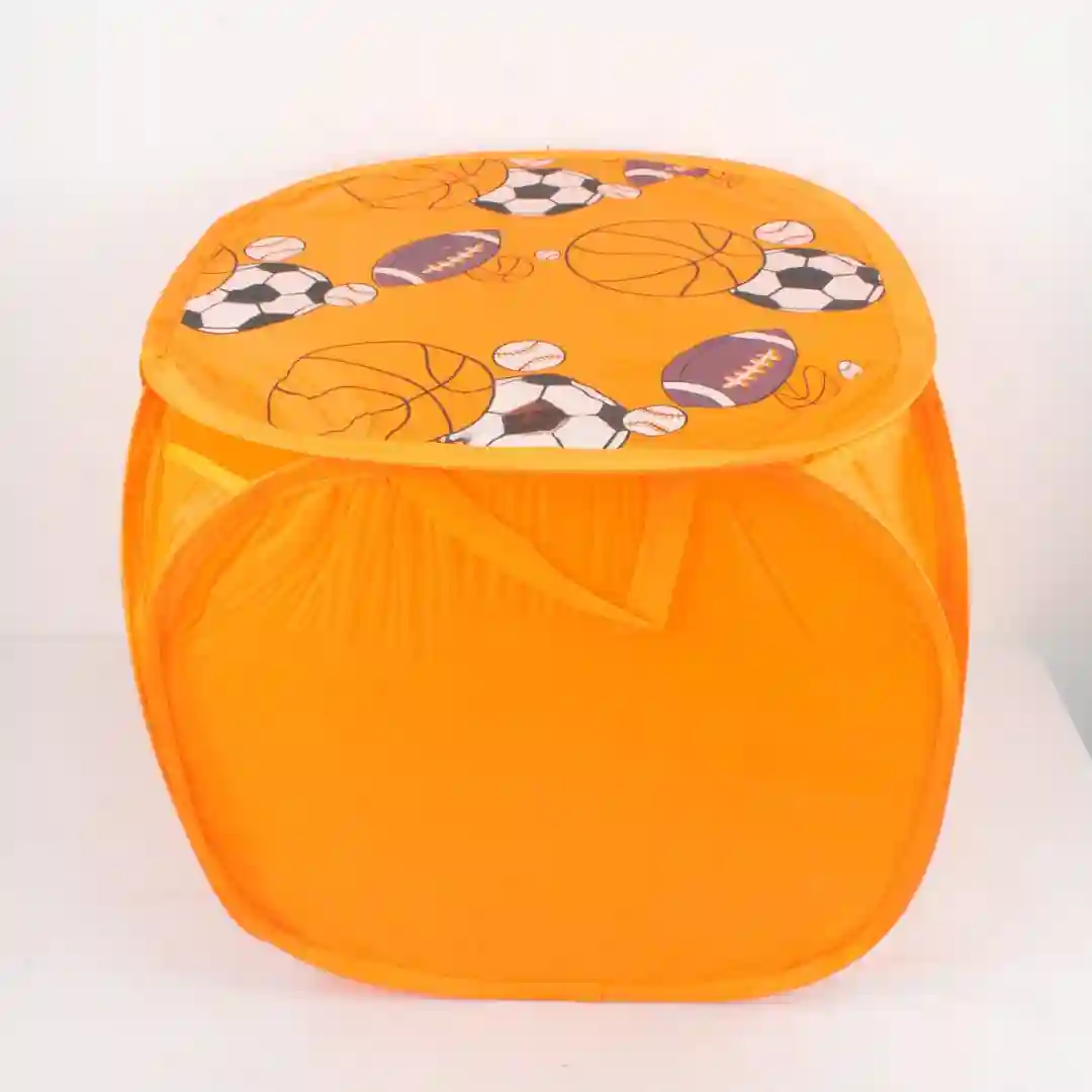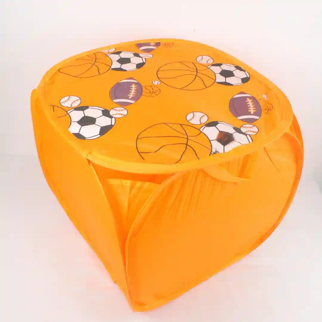 Canasta organizadora plegable diseñada para el almacenamiento práctico de juguetes, ropa u otros artículos personales. Su estructura flexible permite un armado instantáneo y un plegado sencillo para ahorrar espacio cuando no está en uso. Presenta un diseño temático deportivo con estampados de balones de baloncesto, fútbol y fútbol americano, ideal para habitaciones infantiles y áreas de juego.