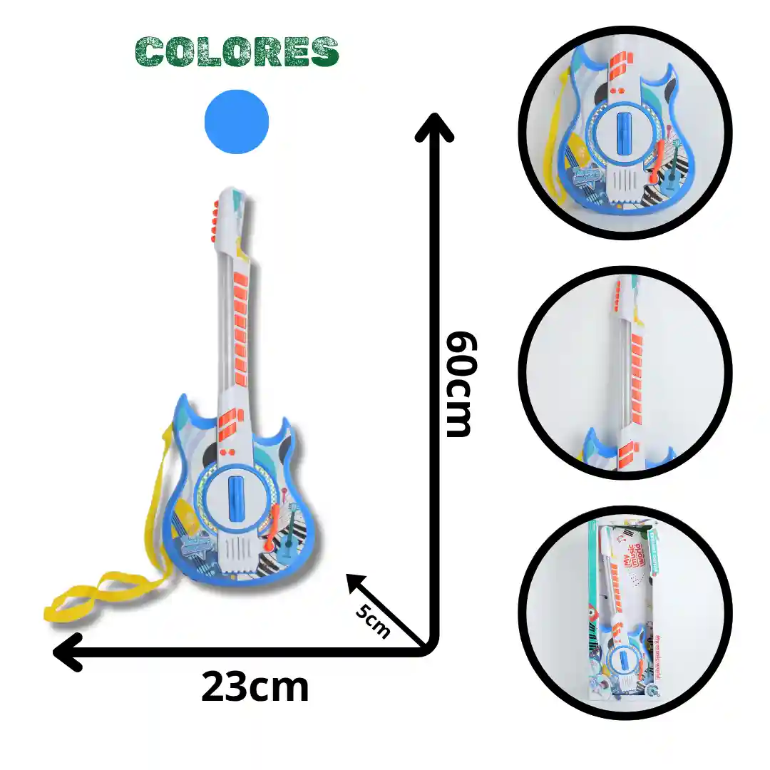 Largo de la Guitarra: 56 – 60 cm (similar a un ukelele o guitarra de juguete grande).
