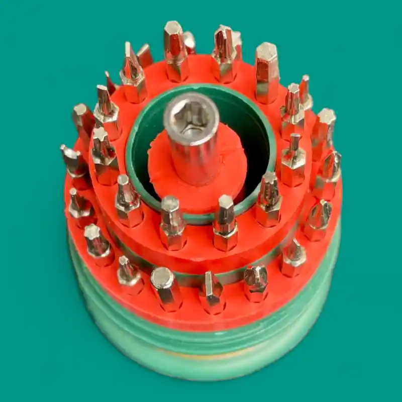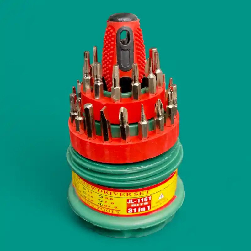 - 31 Piezas en 1: Incluye una amplia gama de puntas de destornillador de diferentes tipos y tamaños (planas, Phillips, hexagonales, Torx, etc.), adaptándose a una gran variedad de tornillos.