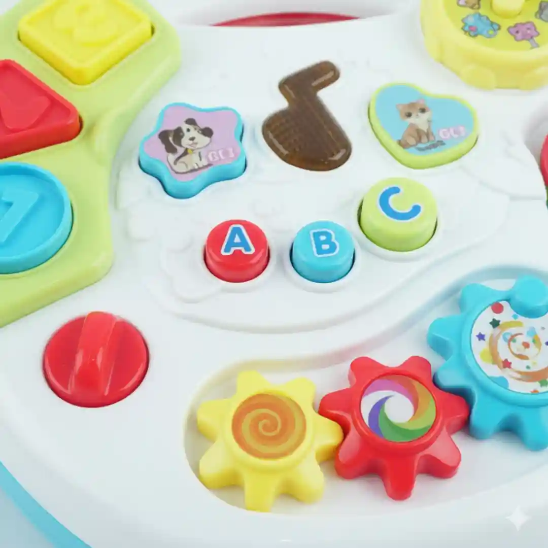 Este no es un juguete silencioso, ¡y eso es genial para el desarrollo! El nombre del producto ya nos lo dice: incorpora la característica de sonido, lo que sugiere que cada vez que el bebé presione uno de los botones o interactúe con el juguete, recibirá una respuesta auditiva. Esto es clave para el desarrollo de la relación causa-efecto y la estimulación de su oído.