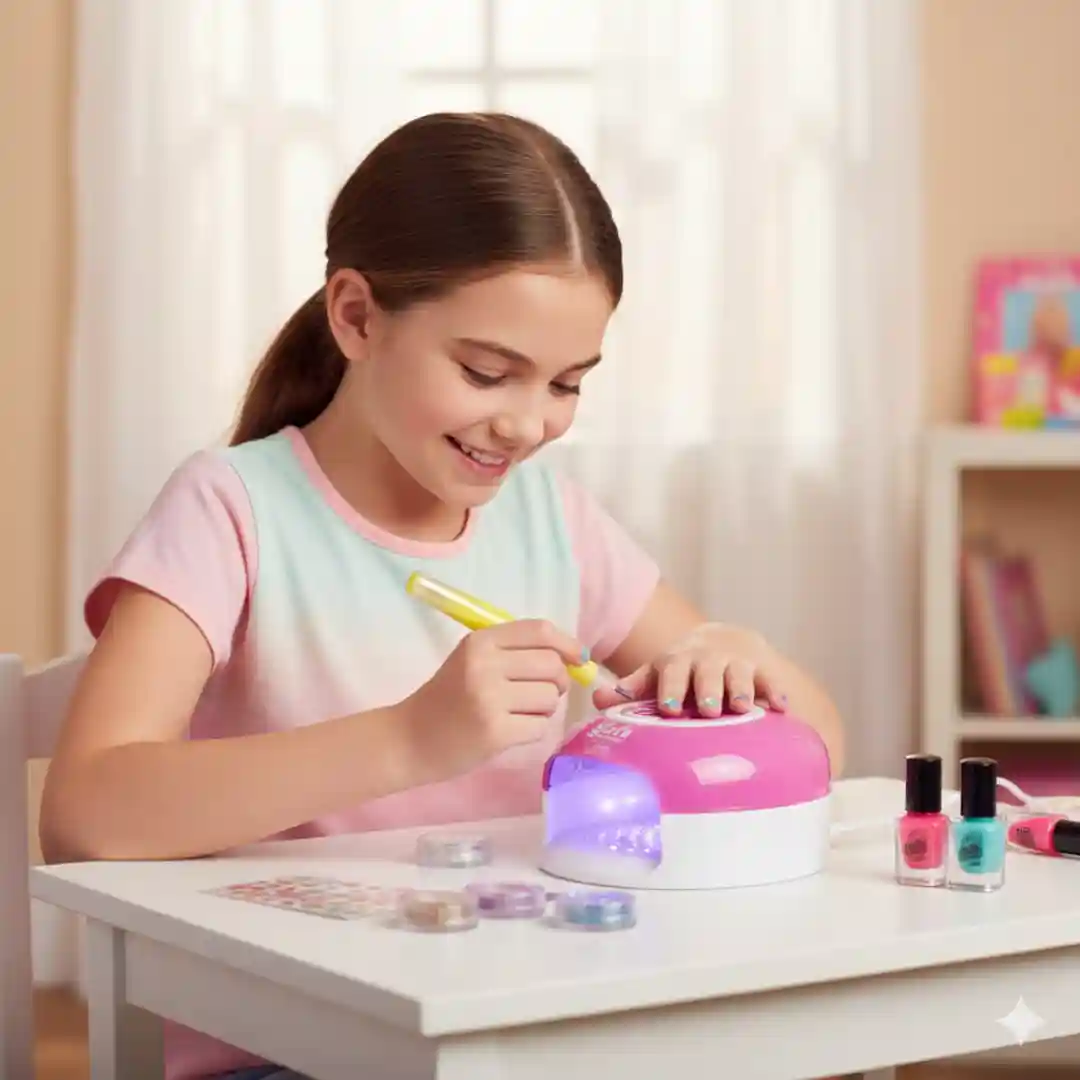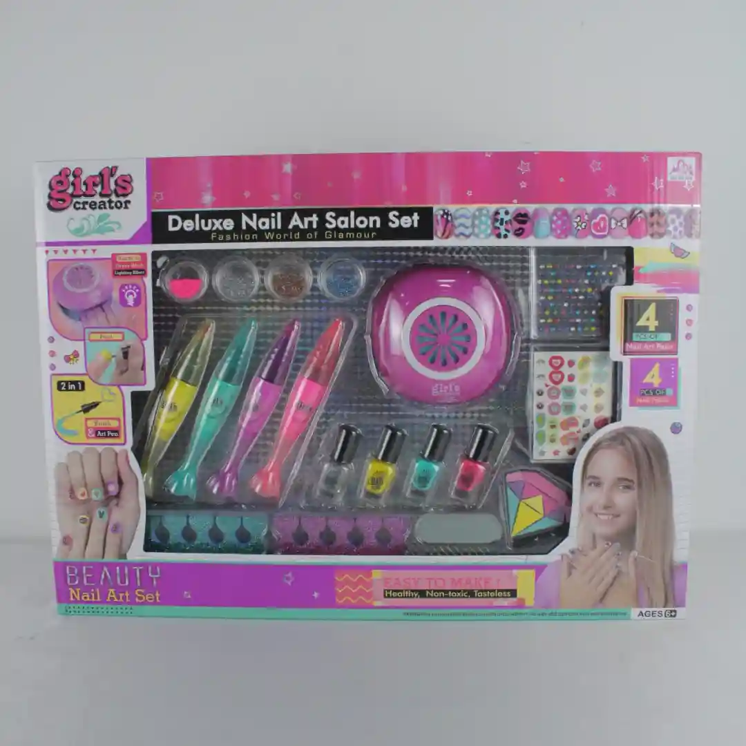 Este kit es un set de belleza de gran formato diseñado para el juego creativo y de simulación de manicura, siendo un producto de alta demanda en la categoría de juguetes para niñas. La inclusión de una lámpara/secador de uñas funcional lo convierte en un artículo premium con un alto valor percibido.