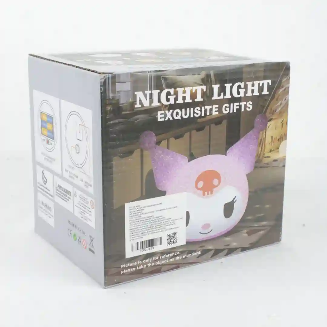 Luz nocturna (Night Light) diseñada como un regalo exquisito (Exquisite Gifts), ideal para ambientar y decorar habitaciones con un toque tierno y moderno. Esta lámpara de personaje presenta una superficie con textura granulada en tono lila que permite una difusión de luz suave y acogedora. Es un accesorio funcional que ofrece múltiples opciones de energía, adaptándose perfectamente a mesas de noche o escritorios.