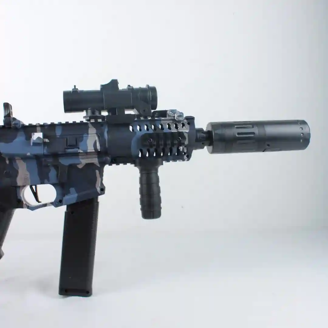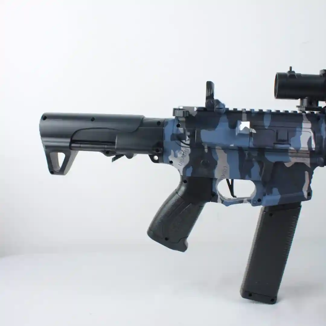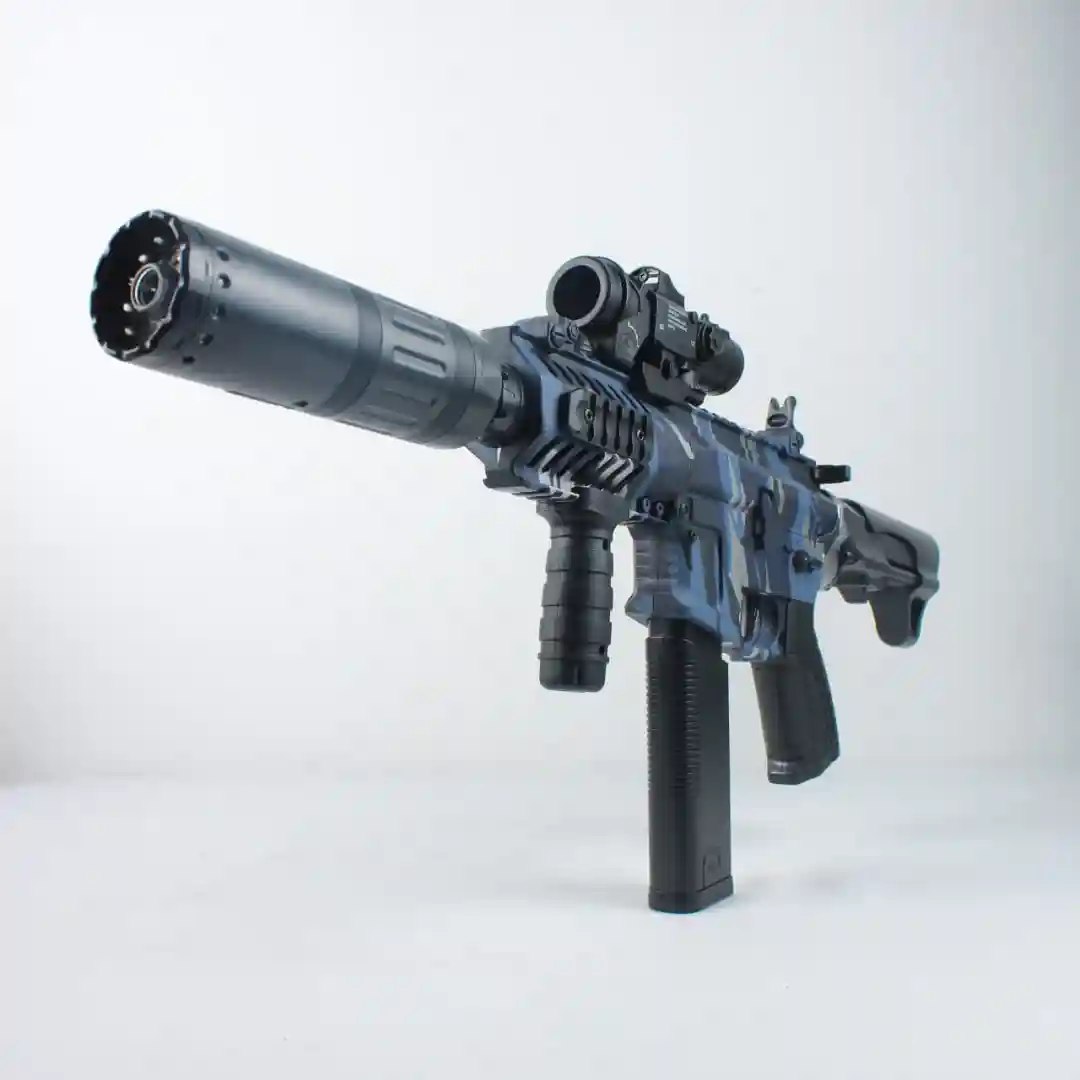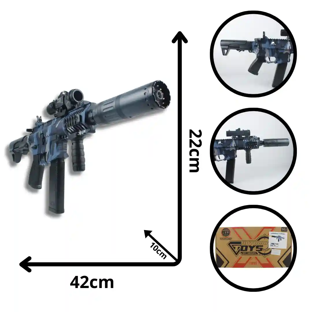 Contenido del Paquete: 1 Lanzador de hidrogel, 1 Silenciador, 1 Mira telescópica, 1 Mira de punto rojo, 1 Batería, 1 Cable de carga y 1 Sachet de bolas de hidrogel.