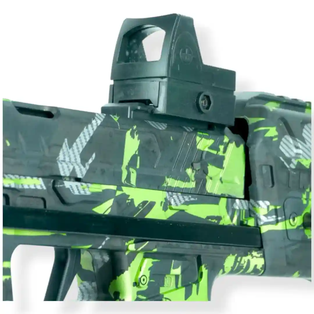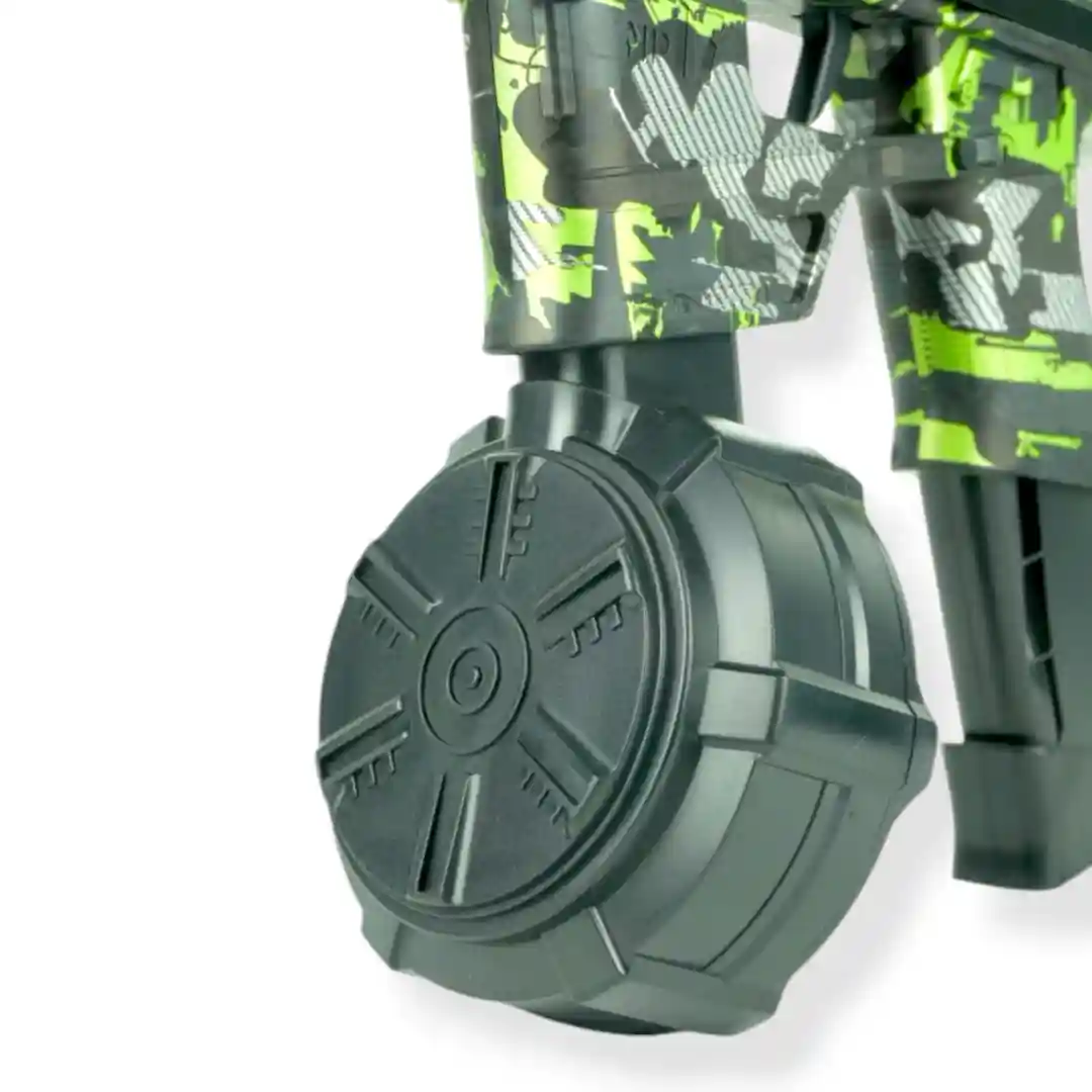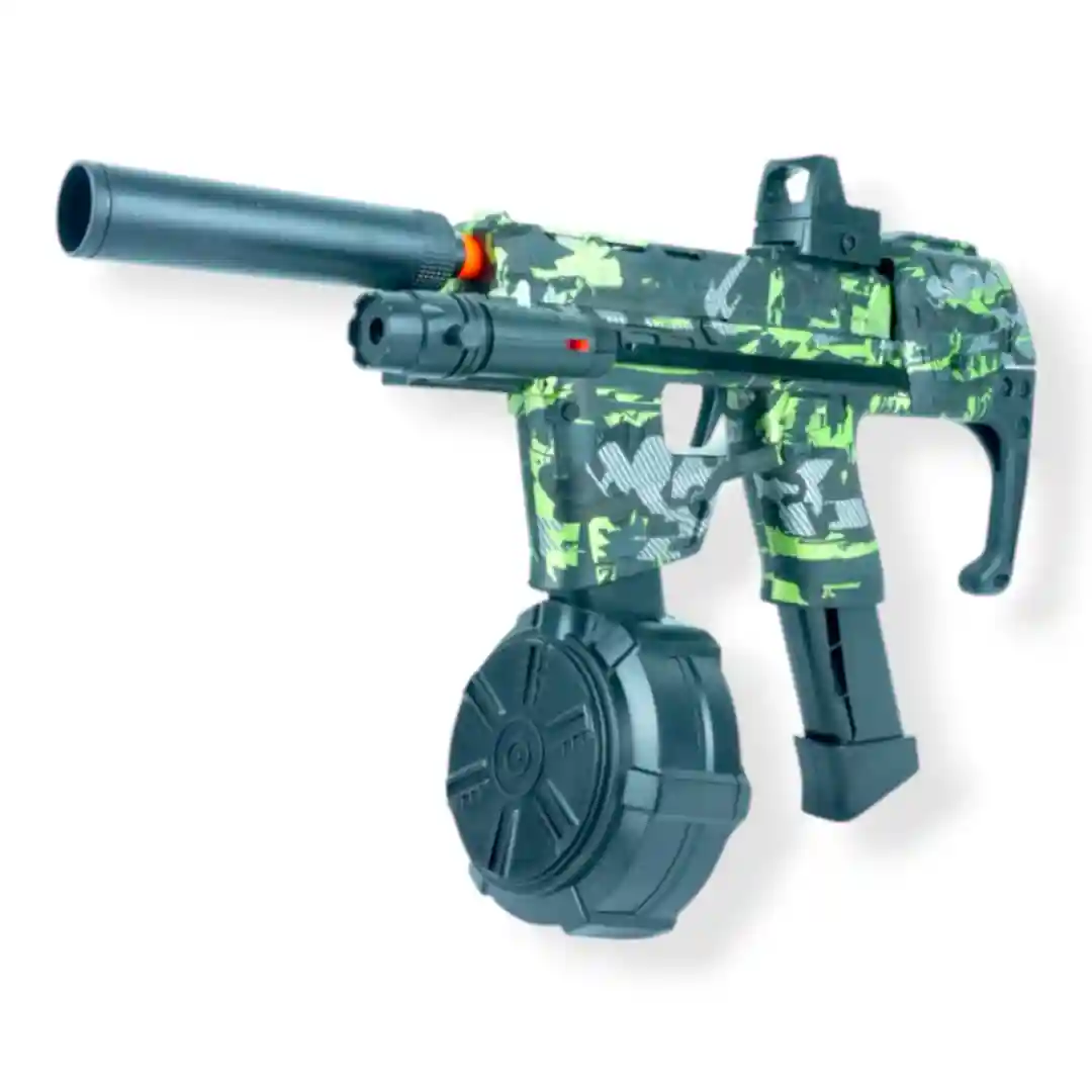 Este lanzador de bolas de hidrogel, con un diseño de camuflaje en tonos verde y negro, está diseñado para un público mayor de 14 años. El producto ofrece una experiencia de juego al aire libre, ideal para actividades recreativas. Viene empacado en una caja individual que facilita su exhibición y venta.