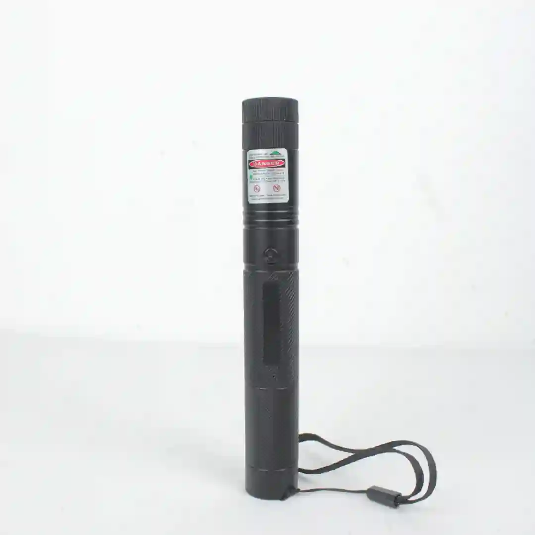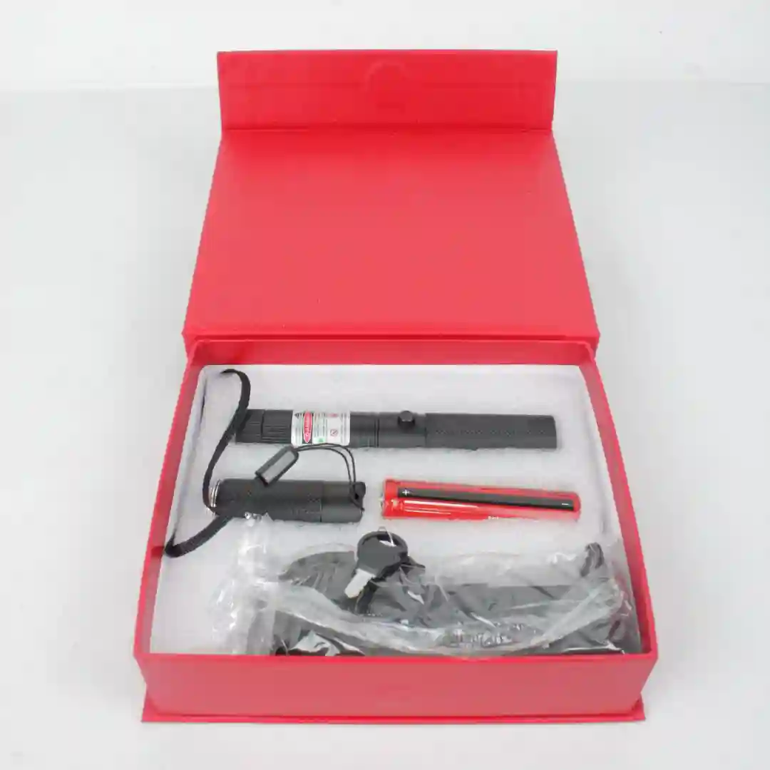 Puntero láser de alta potencia con emisión de luz color verde, diseñado para aplicaciones de señalización, presentaciones y uso en exteriores. Este dispositivo destaca por su construcción robusta y su capacidad de generar un haz de luz visible a larga distancia, presentado en un estuche de protección premium para su almacenamiento y transporte.
