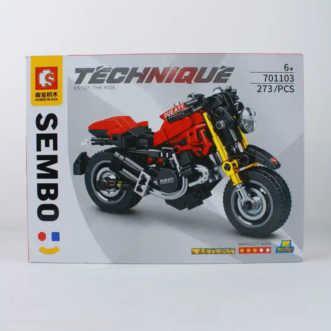 Ofrecemos el Kit de Construcción de Motocicletas SEMBO Technique, un set de bloques diseñado para captar la atención de coleccionistas y entusiastas de los modelos a escala. Esta serie incluye tres referencias distintas: 701103 (273 piezas), 701102 (301 piezas), y 701114 (289 piezas). Cada modelo representa una motocicleta deportiva con un alto nivel de detalle técnico. El producto se distribuye en una caja que contiene los tres modelos, lo que permite ofrecer una variedad atractiva para el consumidor final.