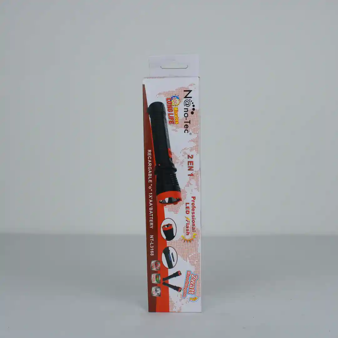 Esta es la linterna recargable 2 en 1 Nano-Tec NT-L3168, una linterna robusta y versátil que no puede faltar en tu casa. Lo que la hace especial es que, como su nombre lo indica, tiene dos funciones de luz: una luz frontal super potente para iluminar a distancia, ideal para caminar en la oscuridad o buscar algo en el ático; y una luz lateral, perfecta para cuando necesitas una iluminación más amplia, como si fuera una lámpara de mesa o de mano.