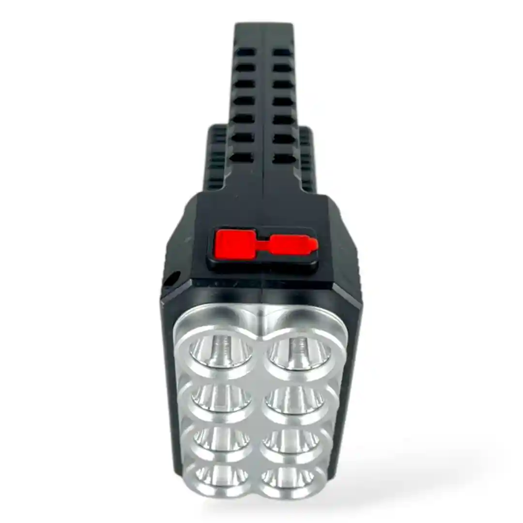 Construcción Duradera y Diseño Ergonómico: Con un diseño en color negro y verde camuflado, la linterna no solo luce robusta sino que está construida para durar. Su diseño angular y el asa de transporte la hacen cómoda de sujetar y fácil de transportar. Los interruptores están estratégicamente ubicados para un control intuitivo de las funciones de luz.