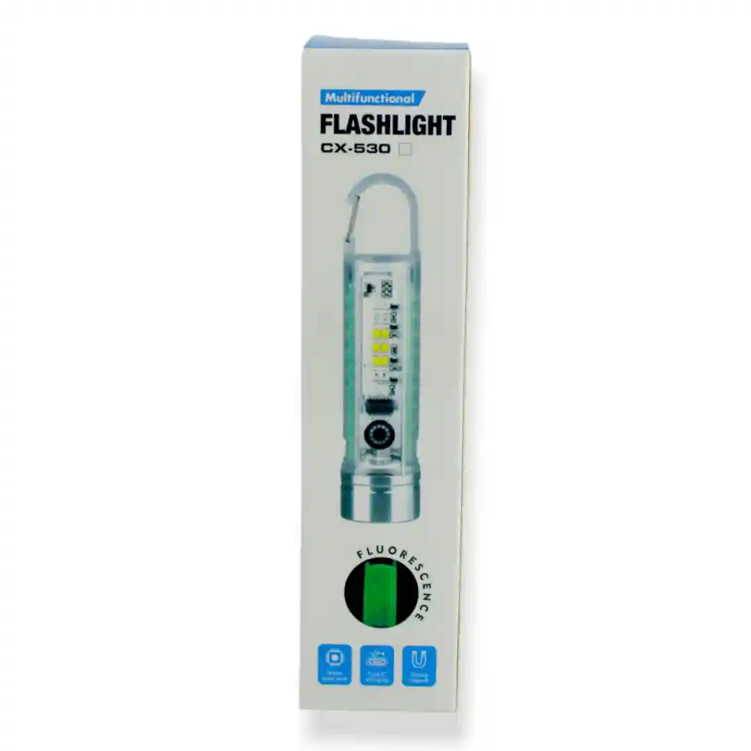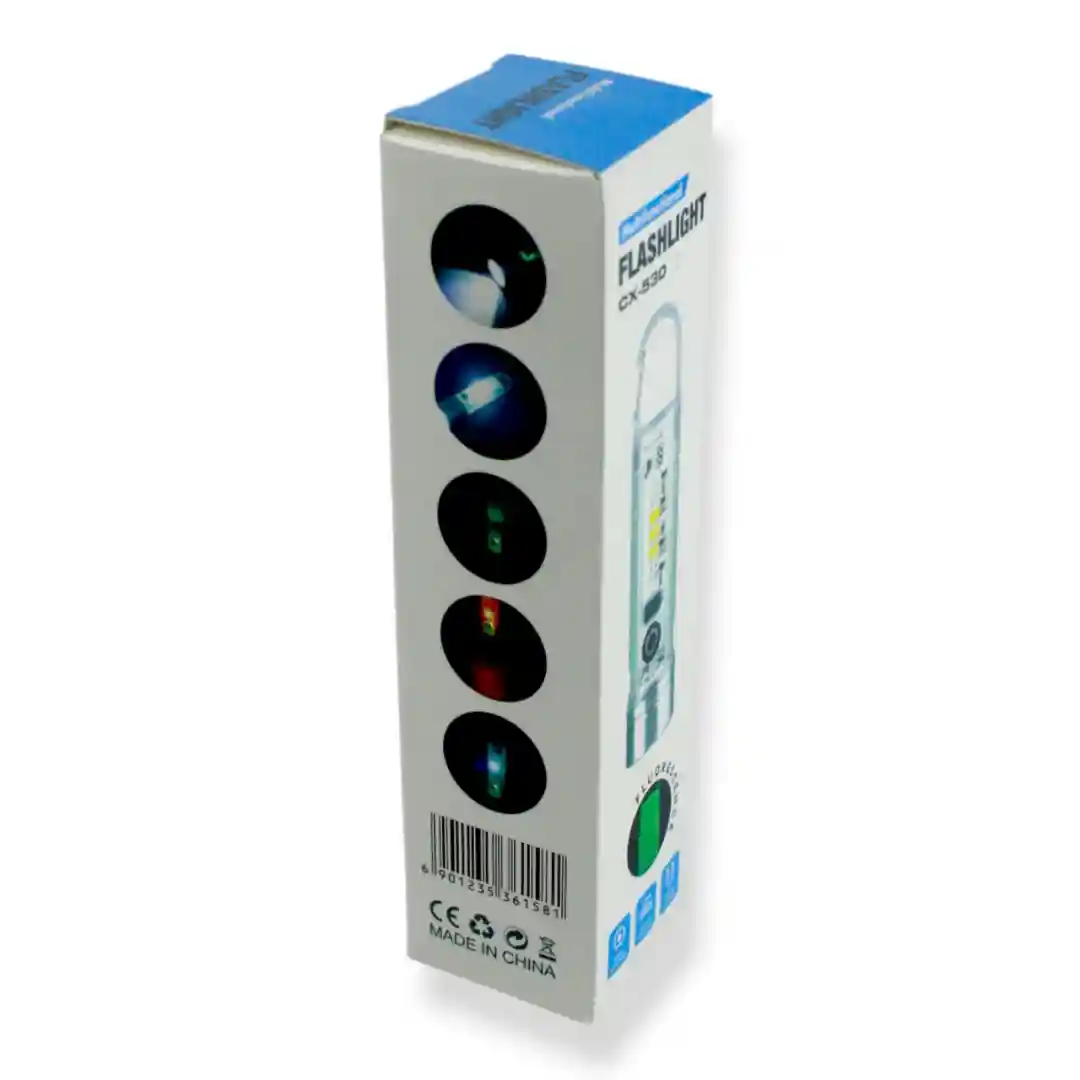 Les presento la linterna multifuncional CX-530A, la linterna que no sabías que necesitabas. Es compacta, mide solo 15 cm de alto y 4 cm de ancho, lo que la hace perfecta para llevarla a todos lados. Su diseño transparente es súper original, permitiendo ver las luces LED de diferentes colores que se activan al usarla. ¡Es como llevar una pequeña fiesta de luz contigo!