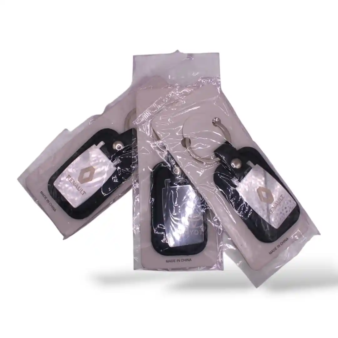 Estos llaveros destacan por su diseño elegante y contemporáneo. Cuentan con una base rectangular de aspecto robusto y un acabado en color negro que simula cuero o un material sintético de alta calidad, proporcionando una sensación premium al tacto. El elemento central es una placa metálica brillante, con un acabado que parece cepillado o pulido, donde el logo de la marca de automóvil está grabado con precisión. La imagen muestra claramente el icónico rombo de Renault y el emblema de Toyota, sugiriendo que la colección incluye algunas de las marcas más populares y reconocidas en el mercado.