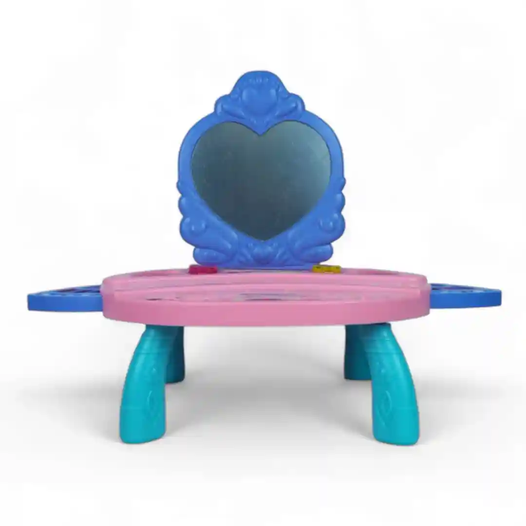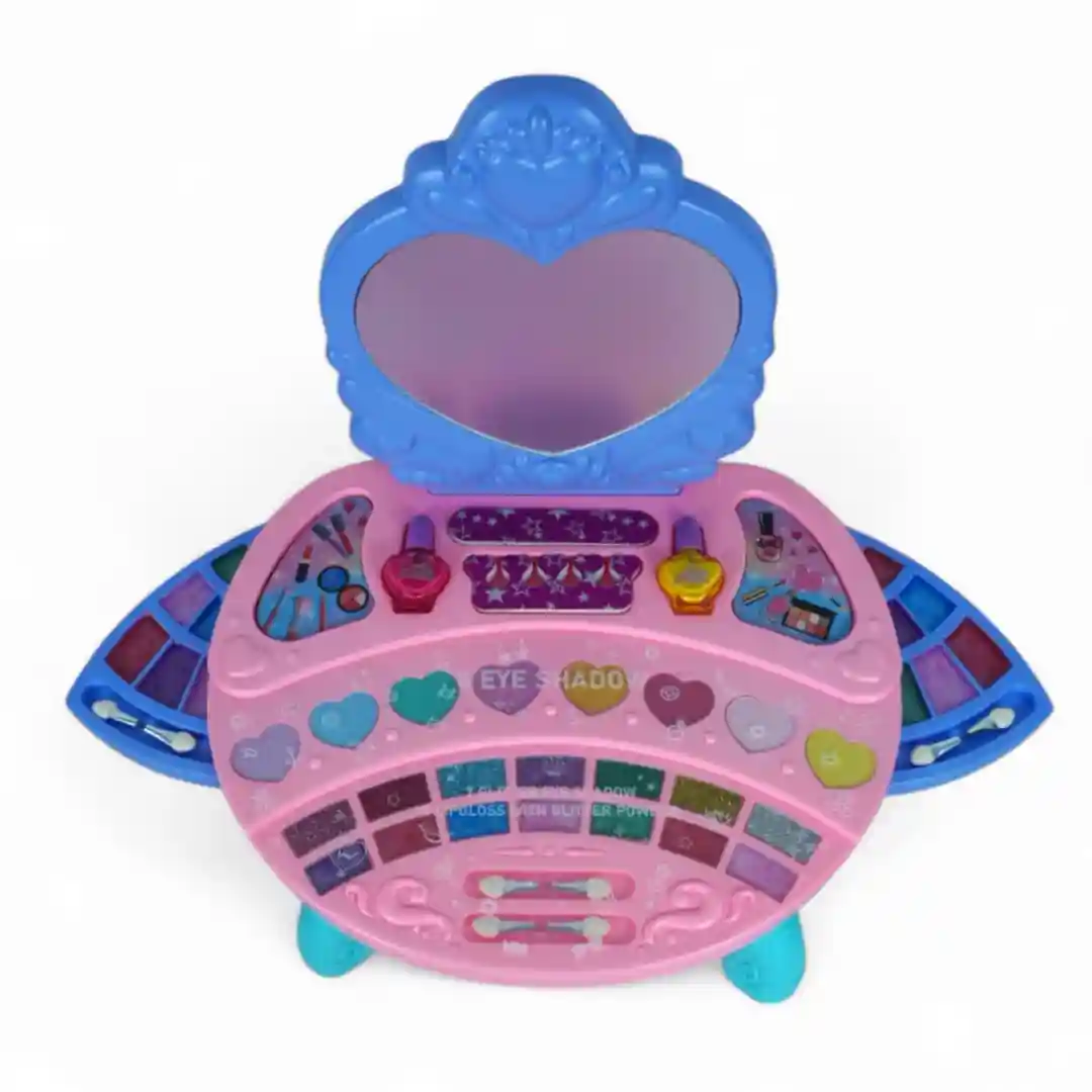 El Set de Maquillaje 2106H se presenta en un estuche portátil con un diseño adorable en tonos rosa y azul, coronado por un espejo en forma de corazón, ideal para que las niñas se vean mientras experimentan con sus looks. Este espejo es perfecto para que practiquen sus habilidades y se diviertan imaginando que están en su propio salón de belleza.