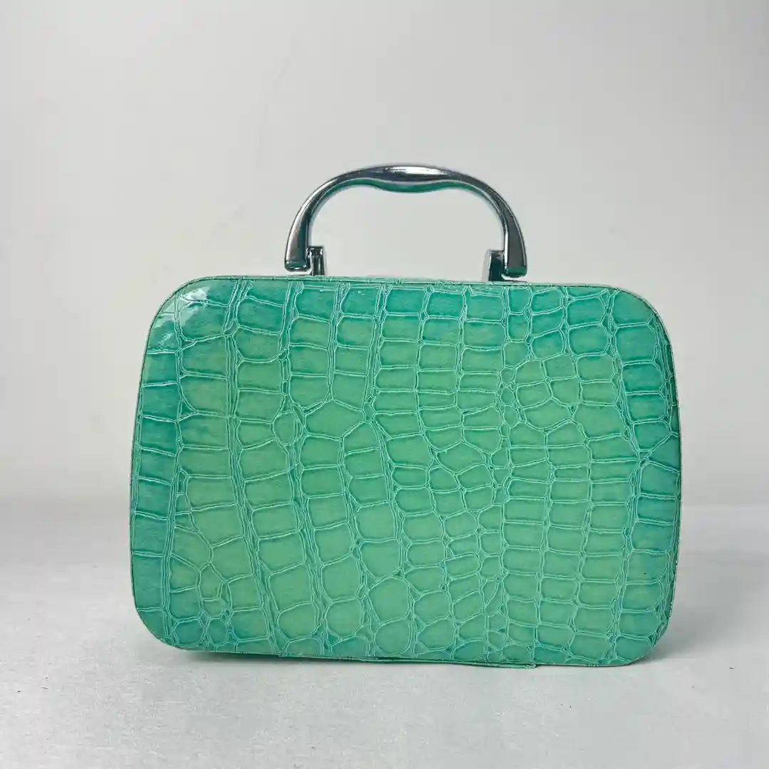 Material: Exterior con acabado de imitación de piel de cocodrilo, disponible en múltiples colores (Rojo, Naranja y Verde Menta). Asa metálica para un transporte cómodo y seguro.